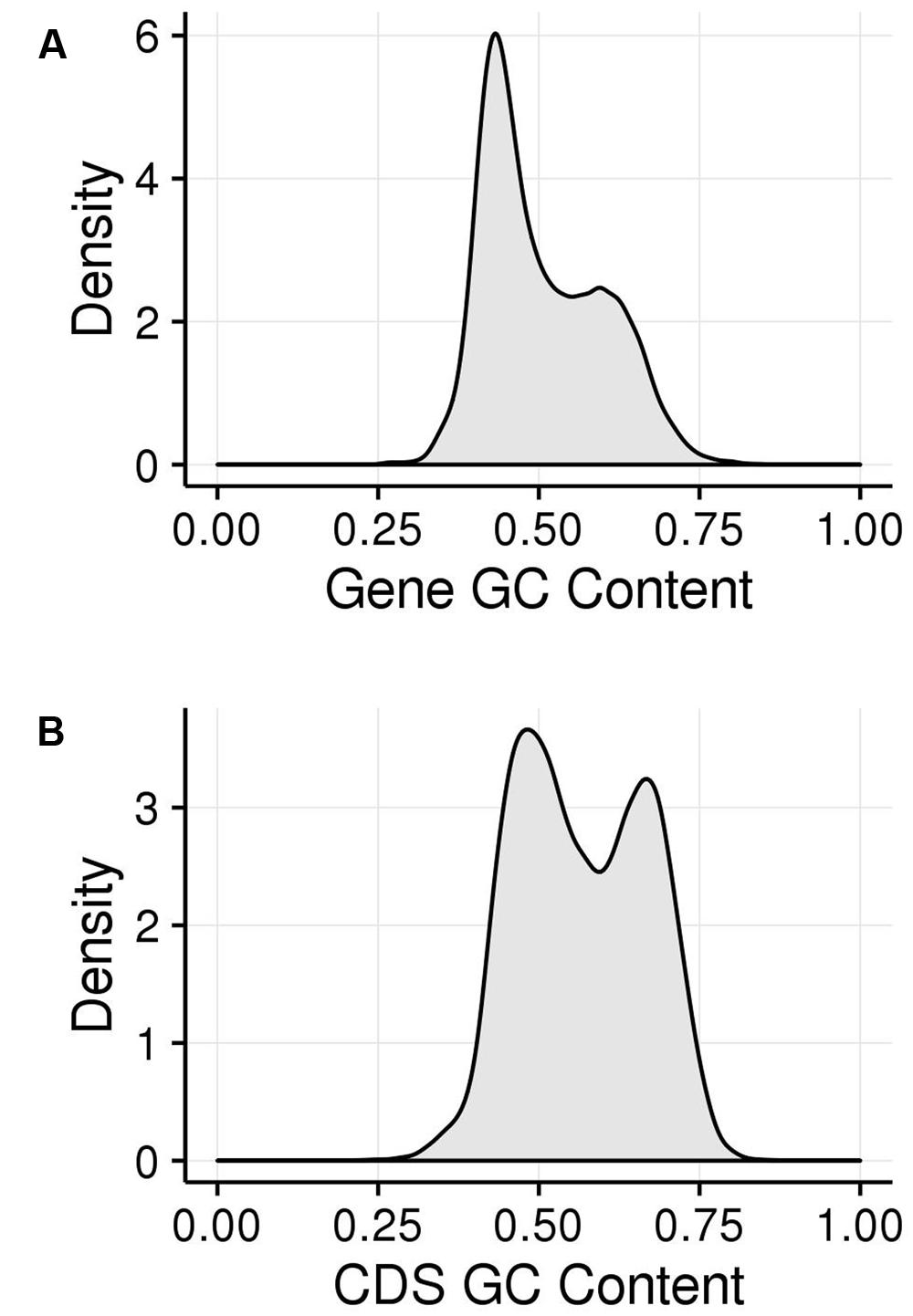 FIGURE 2. GC patterns within maize coding regions shown in kernel density plots. (A) Histogram of GC content of genes (including exons and introns). (B) Histogram of GC content of genes (just CDS sequence). The area under the curve represents the probability of getting a value in a given range of GC content, with the area under the entire curve equal to 1.