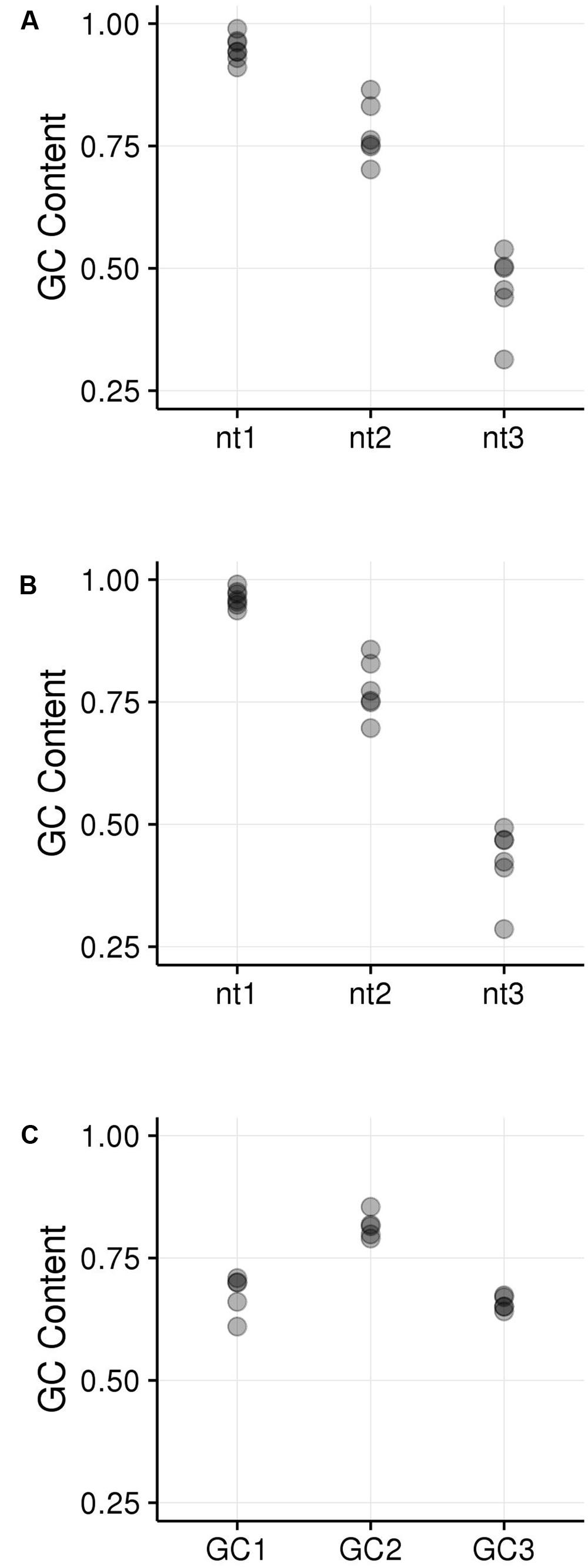 FIGURE 5. GC content within hotspot motifs was compared between 3 nt-based periodicity groups across all motif instances. (A) All hotspot motifs are plotted in groups of every third nucleotide starting with nt1, nt2, or nt3. The nt1 group includes GC content calculated across all motifs for nucleotide positions 1, 4, 7, etc. Each position was analyzed separately. Likewise, the nt2 and nt3 groups have GC content calculated for every third nucleotide position starting with nt2 and nt3, respectively. (B) All genic hotspot motifs are plotted in groups of every third nucleotide as in (A); (C) The reading frame of the motif was determined in order to place nucleotides into the GC1, GC2, and GC3 categories. Then, GC content was calculated for the GC1, GC2, and GC3 position within the motif, trimming the end nucleotide overhangs that resulted when shifting motifs to line up GC1, GC2, and GC3 positions.