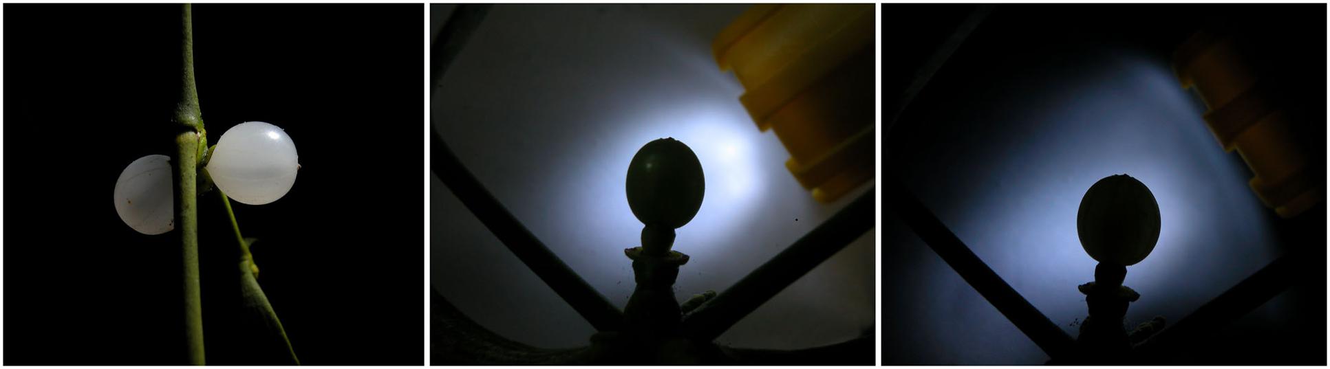 FIGURE 2. Cabin and camera in use. The hut (Figure 1) shelters the technical equipment as well as the berries to achieve a stable situation for the period of measurements (September to December). (Left) The camera with externally programmed electro-mechanical “finger” on the camera’s trigger; the LED flashlight (yellow) that switches on whenever a picture is taken. Lamp, camera and light reflection screen are attached and held by a solid metal structure with clamps and flexible but stable metal arms. The power cables are needed to run the camera, the “finger” (trigger) and the flashlight. (Right) A mistletoe berry between lens and light reflector screen.