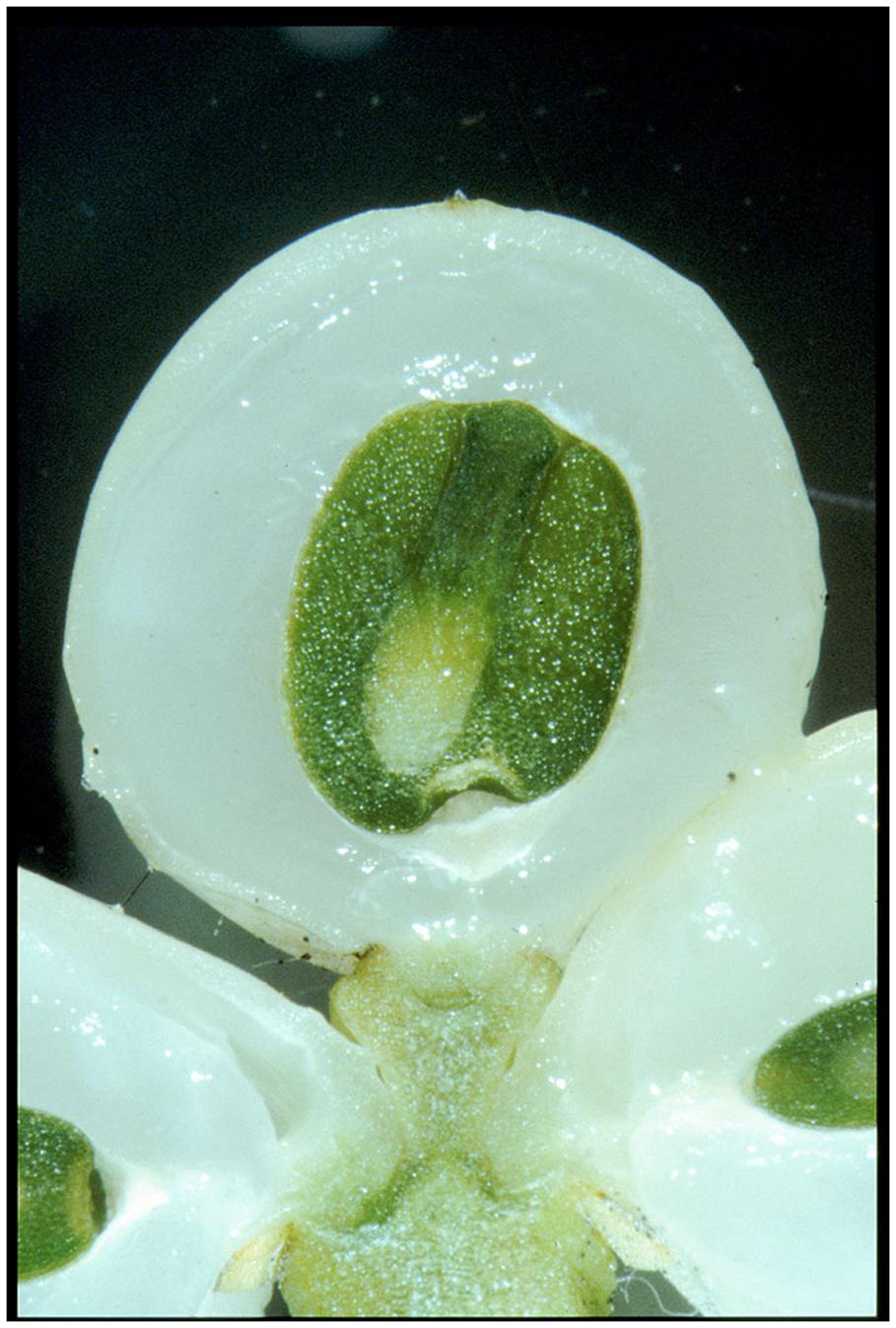 FIGURE 12. Longitudinal section of a ripe mistletoe berry in November. The green embryo with its clearly visible hypocotyl and surrounding endosperm is encircled by the white pericarp. The otherwise strong tension of the skin has collapsed because of the cutting needed for the section (Photo: H. Ramm).
