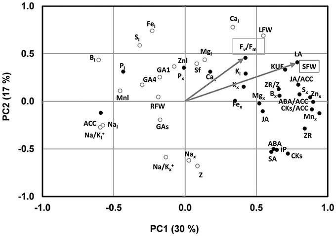 Figure 2. Two axes of a principal component (PC1, PC2) analysis under low K conditions showing shoot fresh weight (SFW) and Fv/Fm trait vectors (indicated by arrow) and the position of all variables (denoted by abbreviations) studied under low K conditions. Hormonal parameters in the xylem sap: ZR, Z, iP, CKs, ACC, ABA, JA, SA, GA1, GA4, GAs; Hormonal ratios: ZR/Z, CKs/ACC, ABA/ACC, JA/ACC; Ionic parameters in the xylem sap: Kx, Nax,Px, Mgx, Sx, Cax, Nax, Znx, Mnx, Fex, Bx, Na/Kx; ionic parameters in the leaf: Kl, Nal, Pl, Mgl, Sl, Znl, Mnl, Fel, Bl, Na/Kl; biomass related parameters and others: SFW, shoot fresh weight; RFW, root fresh weight; LFW, leaf fresh weight; LA, leaf area; sf, sap flow; KUE, K use efficiency. The black and white circles indicate the variables belong to the cluster 1 and 2, respectively.
