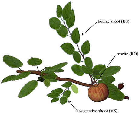 Figure 1. Representation of the three shoot types on the first-order branch of apple. RO, rosette; BS, bourse shoot; and VS, vegetative shoot. Figure produced using the GroIMP platform (Hemmerling et al., 2008).