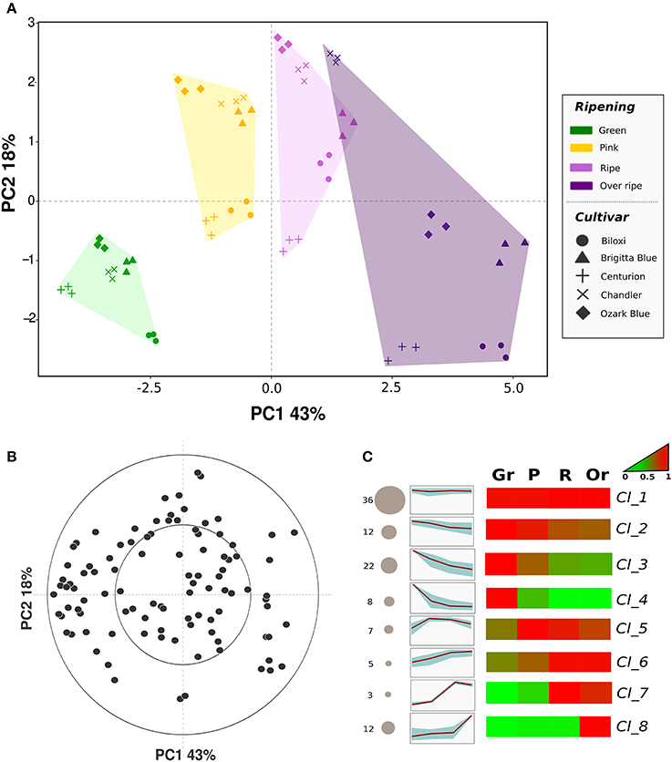 Figure 3. Multivariate analysis of the blueberry VOC profile assessed by PTR-ToF-MS. Plot (A) depicts the VOC profile distribution of five blueberry cultivars at four ripening stages over the PCA score plot defined by the first two principal components. Plot (B) shows the projection of the VOCs identified by PTR-ToF-MS analysis (the high resolution vector form of the loading plot is illustrated in Supplementary Figure 4). Plot (C) reports the sorting of all compounds into eight significant clusters defined by SOTA (Self-organizing tree algorithm) analysis. Several additional information are reported next to each SOTA cluster: the number of compounds (number plus size of circle), heatmap and plot of compound fold changes among time series (normalized data to 0–1 range). Details about each SOTA cluster are reported into Supplementary Table 2.