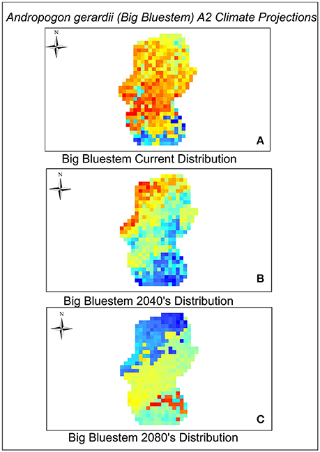 Figure 4. Current (A), 2040 (B), and 2080 (C) distribution of Big bluestem. A2 scenario predictions are coded blue (lowest suitability) to orange—red (highest suitability).