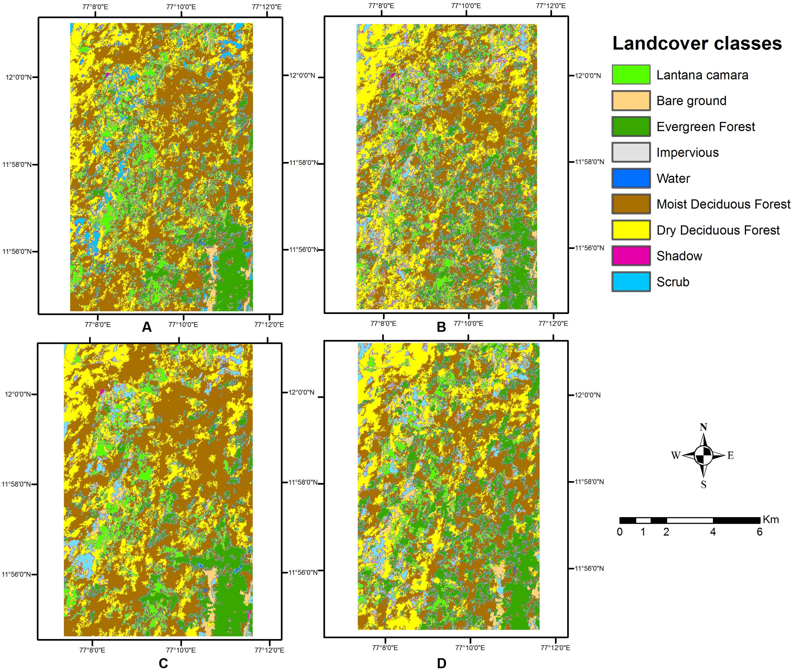 The single wet season classified image created a salt and pepper appearance, as the classes were not identified as contiguous sets of pixels. Several pixels or small groups of pixels appeared interspersed with each other, in a spatially disjunct manner. The two-season combined image, however, shows spatially contiguous classes and less of scattered classes in the image. Some misclassifications in the classes of Scrub and Dry Deciduous Forest seem to have occurred. Incorporating the texture layer in the pixel based classification did not improve much upon accuracies, but a visual inspection of the classified map indicates how clearly the contiguity of classes is maintained in this output. The texture measure helped to keep the spatial integrity of the classes, and thus clumps of pixels emerged as objects in the output. As Lantana shows clumping behavior in the areas it occupies (for e.g., Ramaswami and Sukumar, 2013), and this clumping allows it to spread further in dense thickets (Walton, 2006), it is imperative that this behavior is brought out by the mapping mechanism.