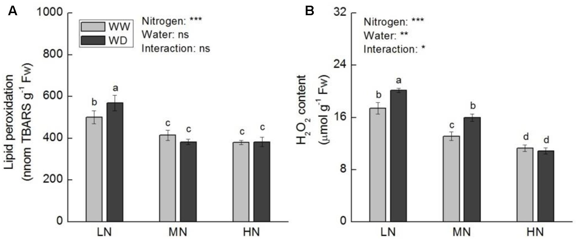 Lipid peroxidation and H2O2 content were decreased as the increase of N level, regardless WD or not (Figure 8). At low N, WD induced significant increases in lipid peroxidation and H2O2 content, while no significant differences were observed between WW and WD at moderate N (excepted H2O2 content) and high N.