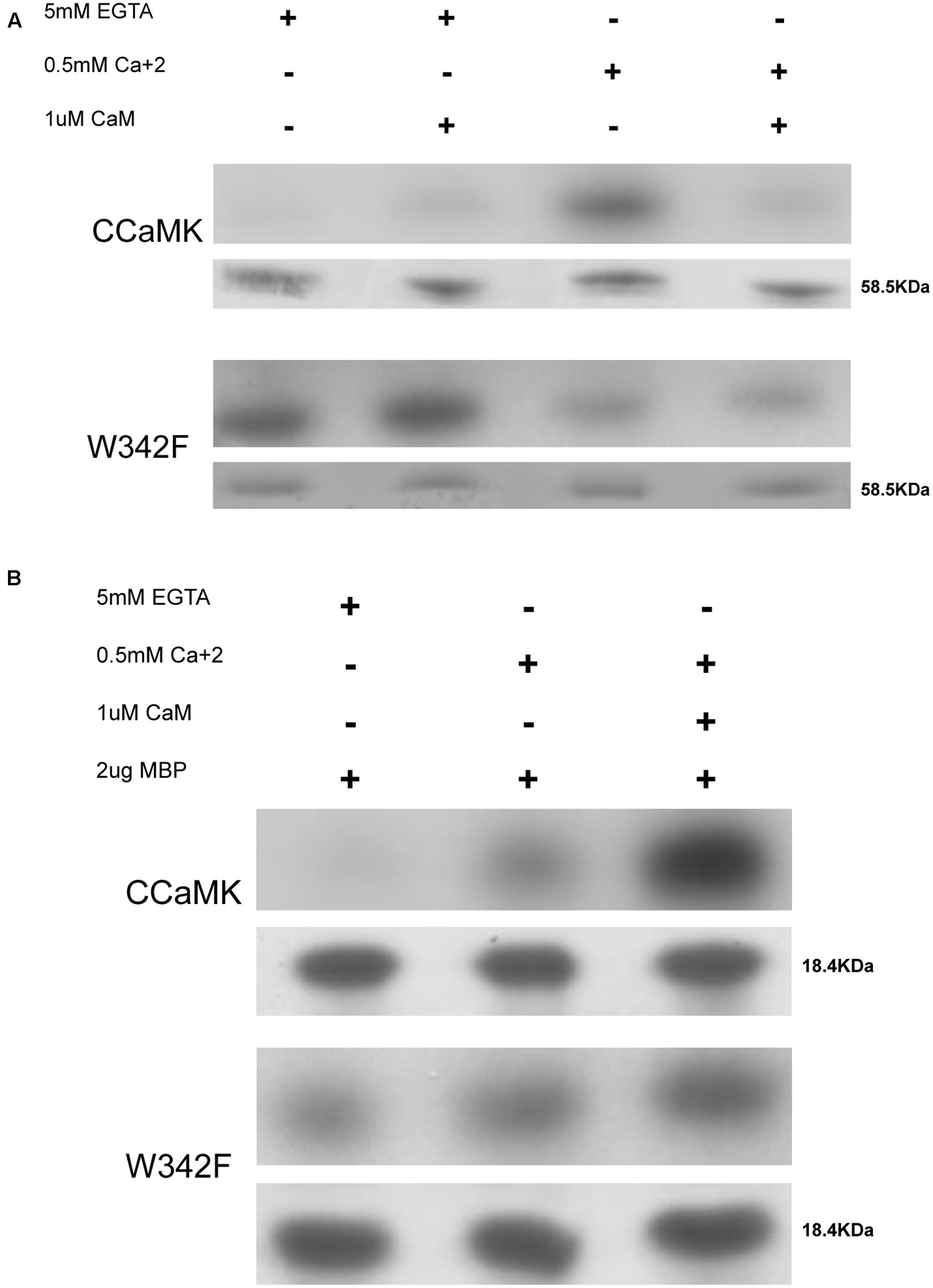 We used bovine MBP as substrate to test the substrate phosphorylation activities of CCaMK. These reactions were performed under three different conditions: (1) in the absence of Ca2+, (2) in the presence of Ca2+, and (3) in the presence of Ca2+ and CaM. The W342F mutant phosphorylated the substrate in all three conditions, with a slightly increased intensity in the presence of both Ca2+ and CaM. Nevertheless, in comparison to CCaMK, this mutant showed a clear reduction in substrate phosphorylation activity even in the presence of Ca2+ and CaM (Figure 2B and Supplementary Figures 1, 2). Thus, in the W342F mutant substrate phosphorylation is Ca2+-independent and also CaM-independent, and barely responds to Ca2+ and CaM inputs.