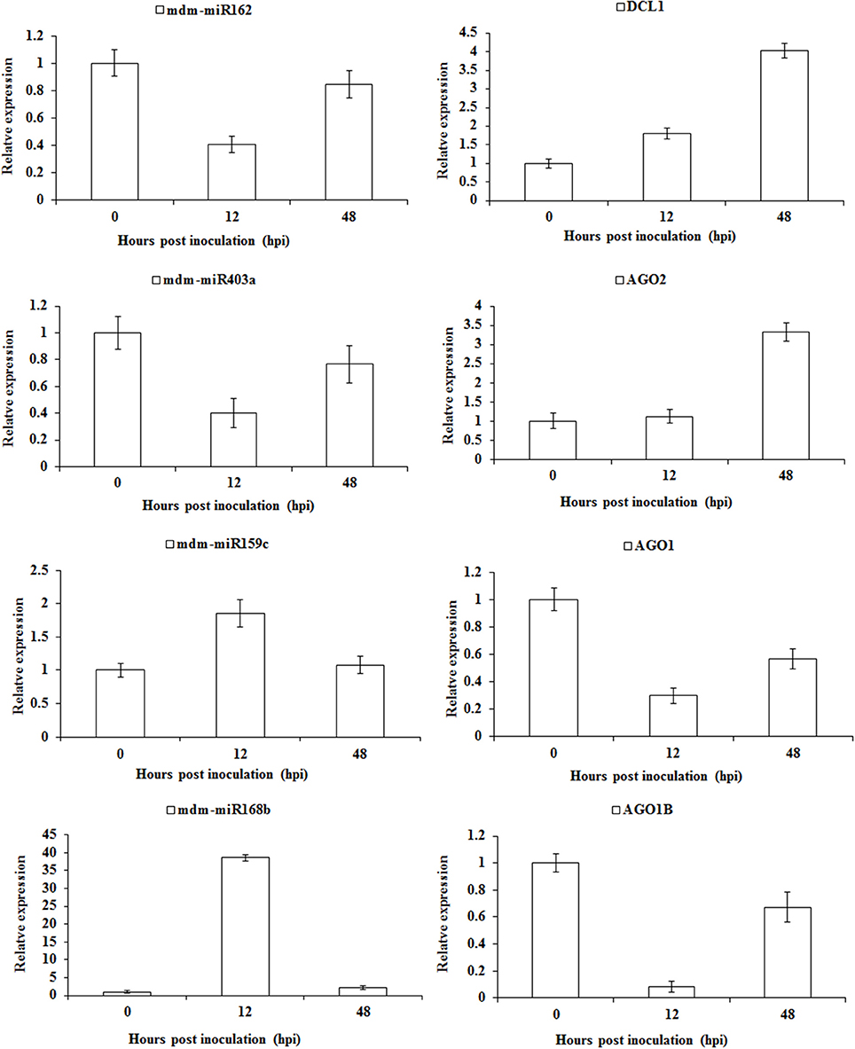 Figure 8. Relative transcription levels of miRNAs and corresponding target genes involved in the feedback regulation of sRNAs pathway in apple twig-Vm interaction. One DCL1, one AGO2, and two AGO1 transcripts were identified to be the target genes of mdm-miR162, mdm-miR403a, mdm-miR159c, and mdm-miR168b. Their transcript accumulation in apple twig bark tissues after challenge with V. mali was analyzed (12 and 48 hpi). The data were normalized to the inner reference gene apple translation elongation factor 1 alpha-subunit (EF-1a, Gene ID/Accession no. DQ341381). The mean value was calculated from three independent biological replicates. The relative expression level was analyzed as the fold-change of the mock-inoculated plants at that time point using the comparative 2−ΔΔCT method.