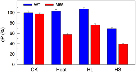 Figure 7. The ratio of the oxidized PQ pool (qP) of WT and M55 under multiple stresses. Cells were grown under normal salt conditions at 30°C and 40 μmol photons m−2 s−1 for 24 h and were transferred to 45°C for 12 h, 300 μmol photons m−2 s−1 for 36 h, or to 0.8 M NaCl for 12 h. Prior to the qP measurements, the Chl a concentration of WT and M55 cells was adjusted to 20 μg mL−1. The ratio of the oxidized PQ pool was determined by the qP parameter, expressed as a percentage of the WT (100%). The qP value that corresponds to 100% is 0.81 ± 0.03. Values are means ± SD (n = 5).