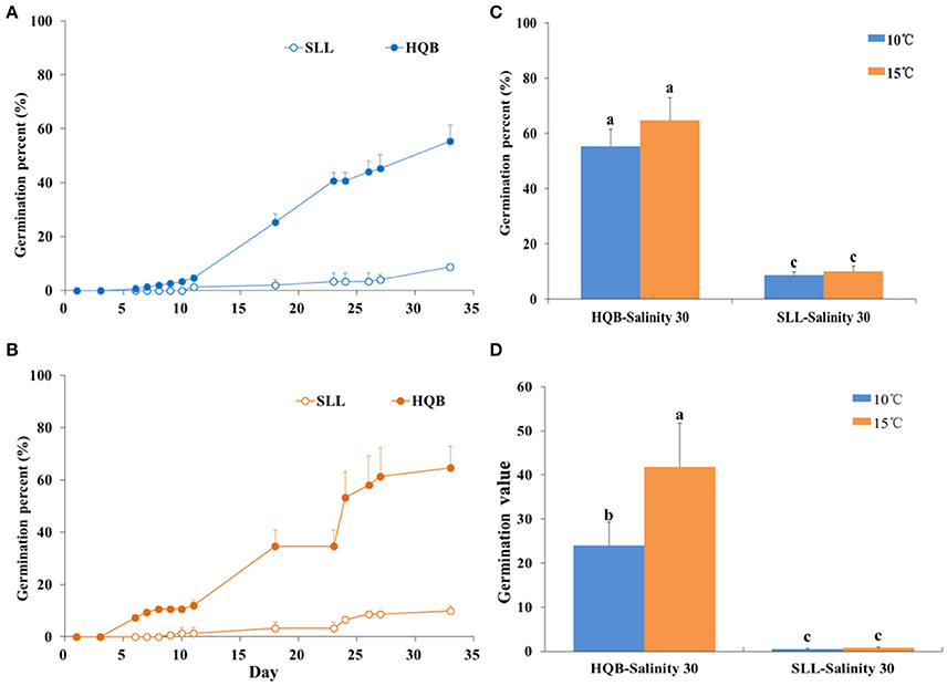 Figure 10. Comparison of the germination percent (GP) and germination value (GV(D)) of Zostera marina seeds from different sources, Swan Lake (SLL) and Huiquan Bay (HQB), subjected to two temperatures (10 and 15°C). (A,B) GP at 10 and 15°C, respectively; (C,D) GP and GV(D) after 4 weeks, respectively. Values are means ± sd. Different lowercase letters (a,b) in (C) and (D) denote significant differences (p < 0.05).