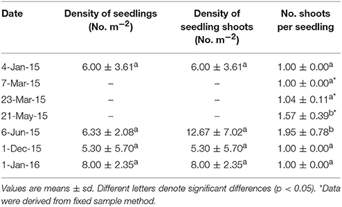 At HQB, which has a higher water temperature than SLL, seed germination occurred much earlier than at SLL. Seed germination started at the beginning of October when the seeds were buried in the sediment, and most seeds germinated during October and November, while we found only three seeds that germinated in the spring (March 2015) in the whole bed. HQB seedling density was <10 seedlings m−2, and there were no differences between January 2014 and January 2015 (Table 4). The clonal growth of seedlings began on 23 March, and increased quickly in May (water temperature >15°C; Figure 2) with 1.57 shoots per seedling by 21 May, then 1.95 shoots per seedling had grown by 6 June (Table 4).