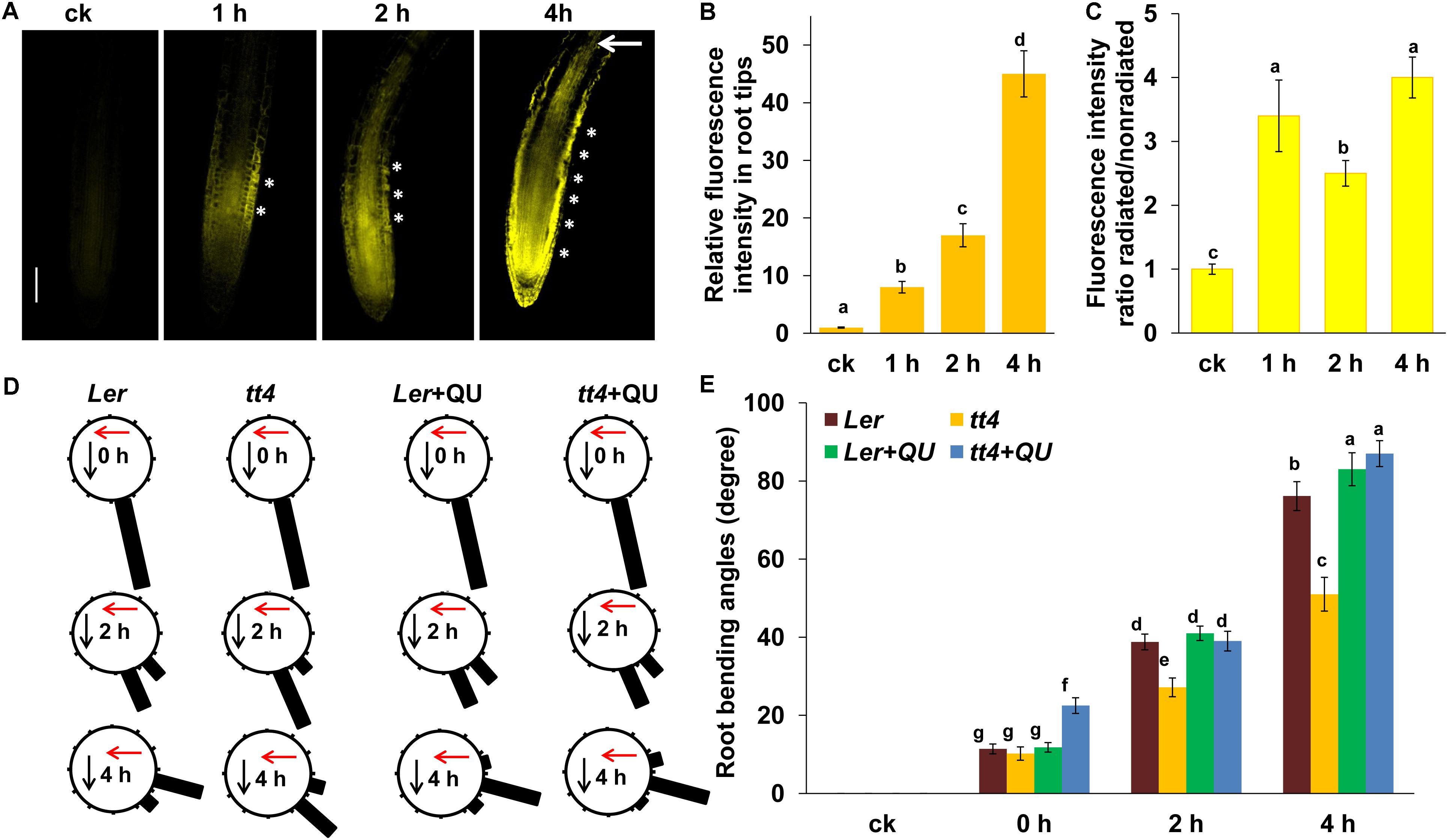 FIGURE 6. Flavonoids are involved in UV-B-induced root bending. (A) DPBA fluorescence in the roots of 5-d-old wild-type Col-0 seedlings exposed to UV-B radiation for 1 h and then transferred to normal growth conditions for 1, 2, and 4 h. Bars, 100 μm. (B,C) Quantification of DPBA fluorescence intensities in root tips (B), and ratios of DPBA fluorescence intensities in the root tips on the radiated side versus the nonradiated side (C) are shown. (D,E) The angle of root bending of Ler and tt4-1 seedlings irradiated with UV-B for 1 h and then transferred to normal growth conditions plus 0 nM QU or 100 nM QU for 1–4 h, n = 60. (D) Each gravistimulated root was assigned to 1 of the 12 30° sectors on a gravitropism diagram. The length of each bar represents the mean percentage of seedlings assigned to the respective sector. The red and black arrows indicate the direction of UV-B radiation and gravity, respectively. (E) The average root bending angles of Ler and tt4-1 seedlings; ck, before UV-B radiation control. White asterisks indicate more pronounced DPBA fluorescence on the radiated side of roots. The error bars represent the ±SE, and different letters indicate significantly different values (P < 0.01 by Tukey’s test).