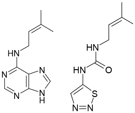 Structures of TDZ and adenine- and 1,2,3-thiadiazol-5-yl urea-based cytokinins. tZ - trans-zeatin, iP-N6-(Δ2-isopentenyl)adenine, DHZ–dihydrozeatin.