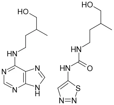 The compound 1,2,3-thiadiazol-5-ylamine was the starting material for the synthesis of 5-isocyanato-1,2,3-thiadiazole, which was prepared as described by Nisler et al. (2016). The compounds TD-tZ, TD-iP, TD-DHZ and compounds 1-15 were prepared by mixing 5-isocyanato-1,2,3-thiadiazole and the corresponding commercially available amine under mild heat (30 to 60°C) in tetrahydrofuran in the presence of a catalytic amount of triethylamine (Goldschmidt and Bardach, 1892). The conversion process was monitored by thin layer chromatography. Since aliphatic amines are not visible under ultraviolet light, the staining with ninhydrine was used to visualize the consumption of an amine. The reaction lasted from 1 h to the maximum of 12 h. After the reaction, the solvent was evaporated, resulting in a solid/semisolid residue that was then purified by flash silica column chromatography using 63 micron Chromatographic silica (Davisil) and CHCl3:MeOH (9:1) mobile phase. The compounds were usually prepared in milligram quantities and the yields varied between 30 and 80%. When the starting amine contained a free hydroxyl group, it was O-protected with a tert-butyldimethylsilyl group prior to condensation with 5-isocyanato-1,2,3-thiadiazole and then de-protected with hydrochloric acid (Greene and Wuts, 1991).