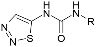 All compounds contain the 1,2,3-thiadiazol ring and urea bridge as well as TDZ. Compounds 6 and 7 are di-alkylated at one urea nitrogen.