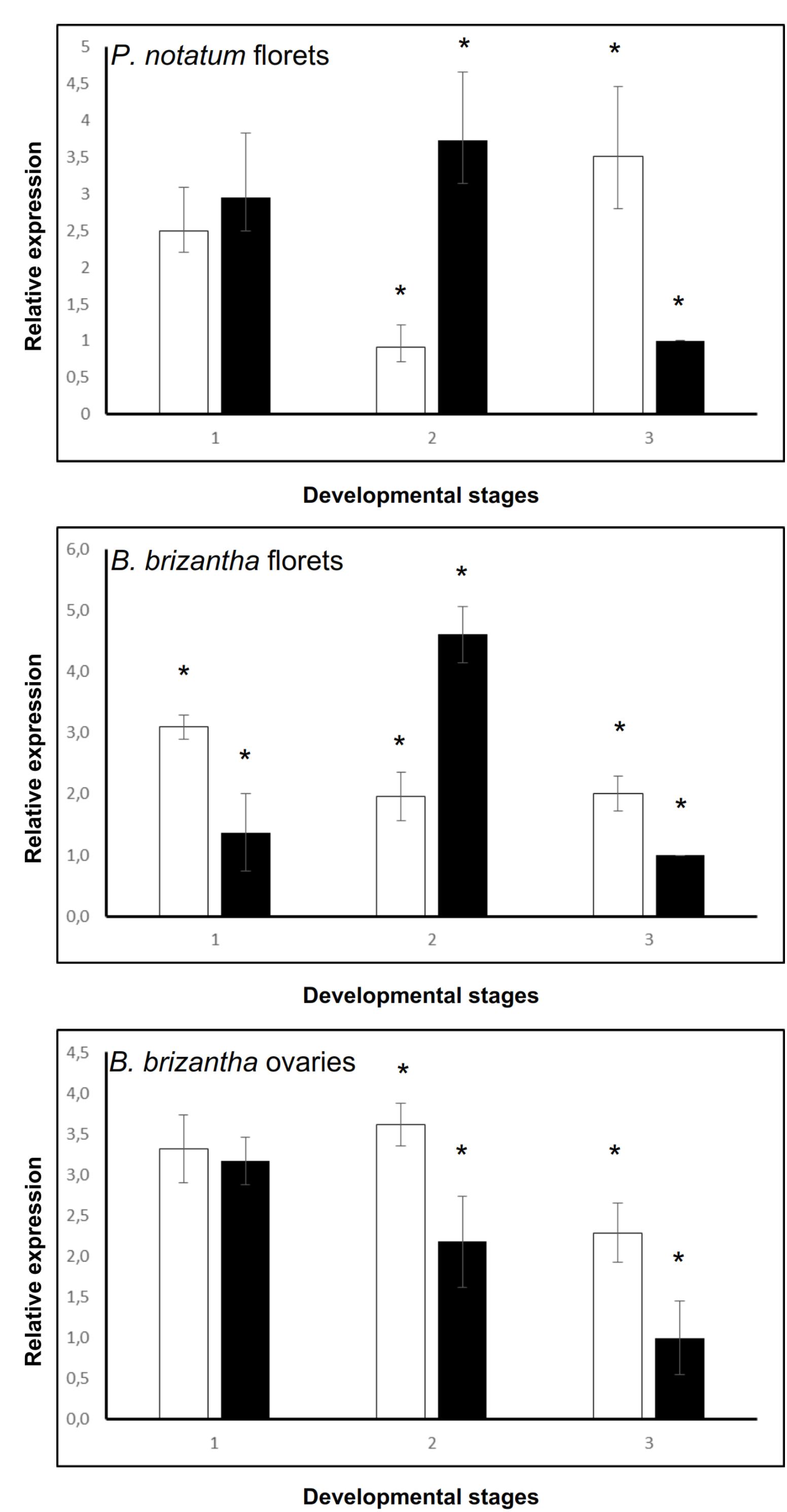 FIGURE 2. Relative quantitative expression of QUI-GON JINN across reproductive stages. (A) P. notatum florets. (B) B. brizantha florets. (C) B. brizantha ovaries. White bars: apomictic plant (genotype Q4117). Black bars: sexual plant (genotype C4-4x). 1: premeiosis; 2: late premeiosis/meiosis; 3: postmeiosis. Control: sexual plant, postmeiosis stage (relative expression = 1). Samples displaying statistically significant differential expression between apomictic and sexual plants were marked with an asterisk at the top.