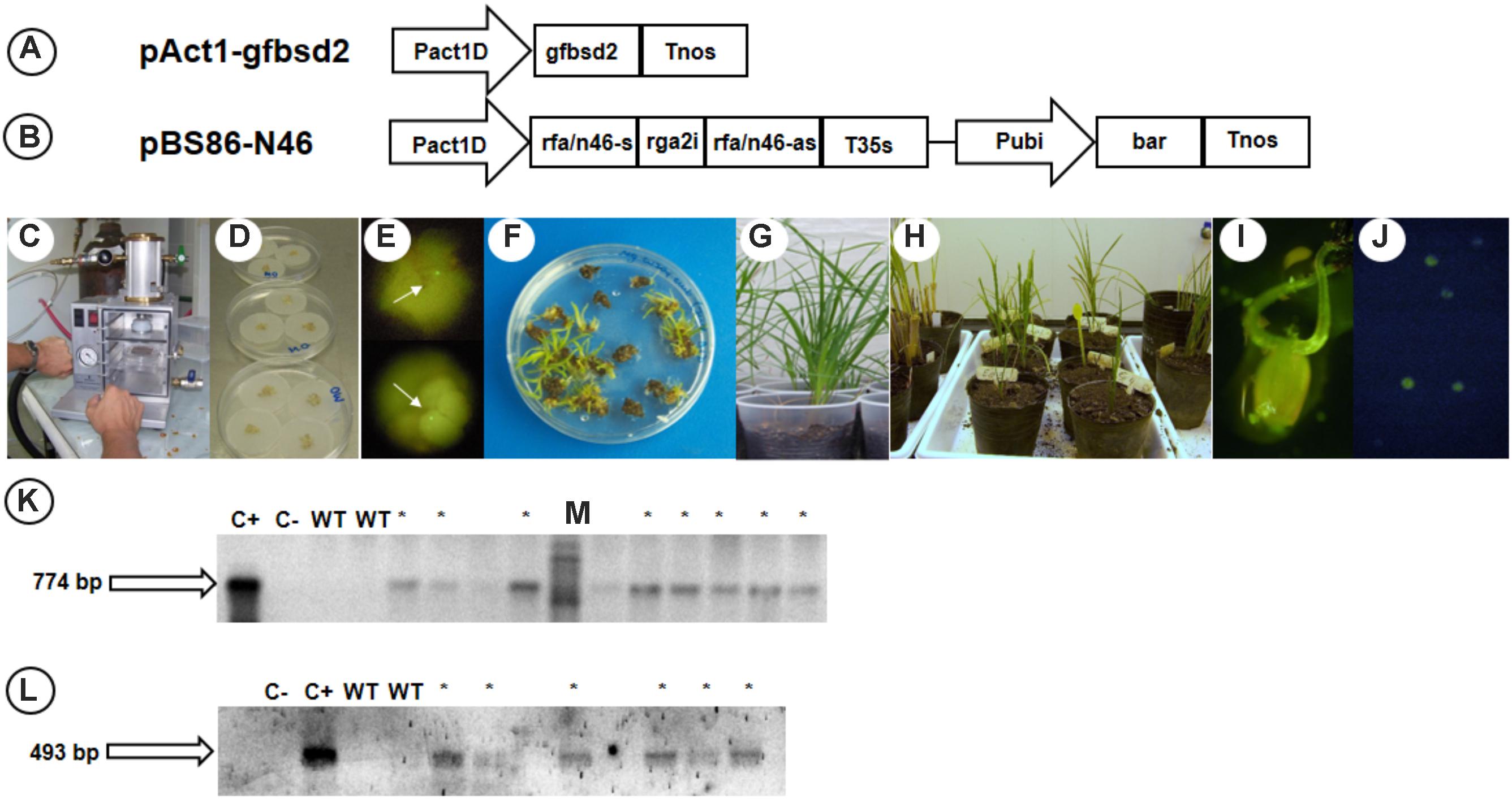 FIGURE 5. Generation of RNAi lines from apomictic genotype (Q4117). (A,B) Schematic representation of transformation vectors pact1-gfbsd2 and pBS86-N46. (C) BIOMIX biolistic device used for plant transformation as disposed previous to bombardment. (D) Calli in osmotic medium. (E) GFP expressing cells (marked by white arrows) indicating transient transformation of calli. (F) Regenerating plants subjected to selective agent glufosinate-ammonium 1 mg/L. (G,H) Rusticated plant in the growth chamber. (I,J) Ovary (I) and pollen grains (J) expressing eGFP. (K) PCR amplification of eGFP in T0 plants. (L) PCR amplification of BAR in T0 plants.