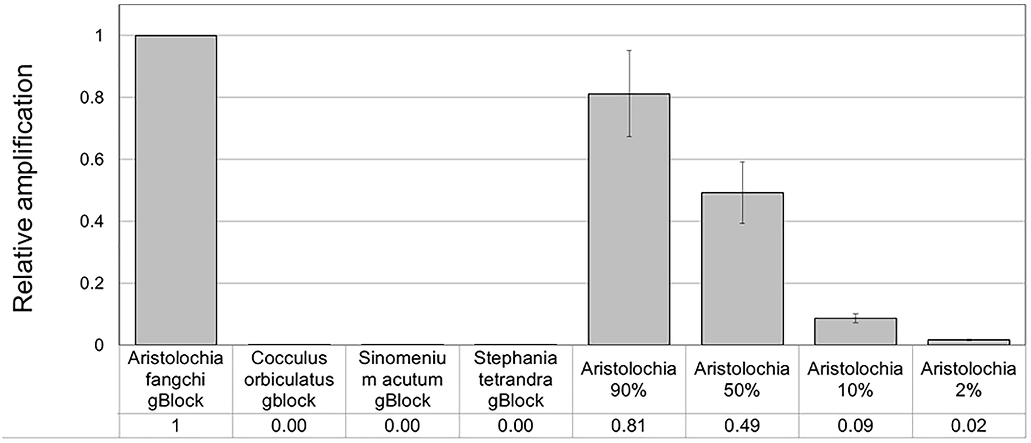 To verify the feasibility of our method in the detection and quantitation of possible Aristolochia contamination in mixed samples, a series of gBlock admixtures containing different amounts of Stephania tetrandra (10, 50, 90, and 98% respectively) and model adulterant Aristolochia fangchi DNA were prepared (Table 4) starting from the gBlocks S-5 dilution. Each of these mixtures was then diluted 1:10, 1:100, and 1:1000 to check detection limits (Table 4).