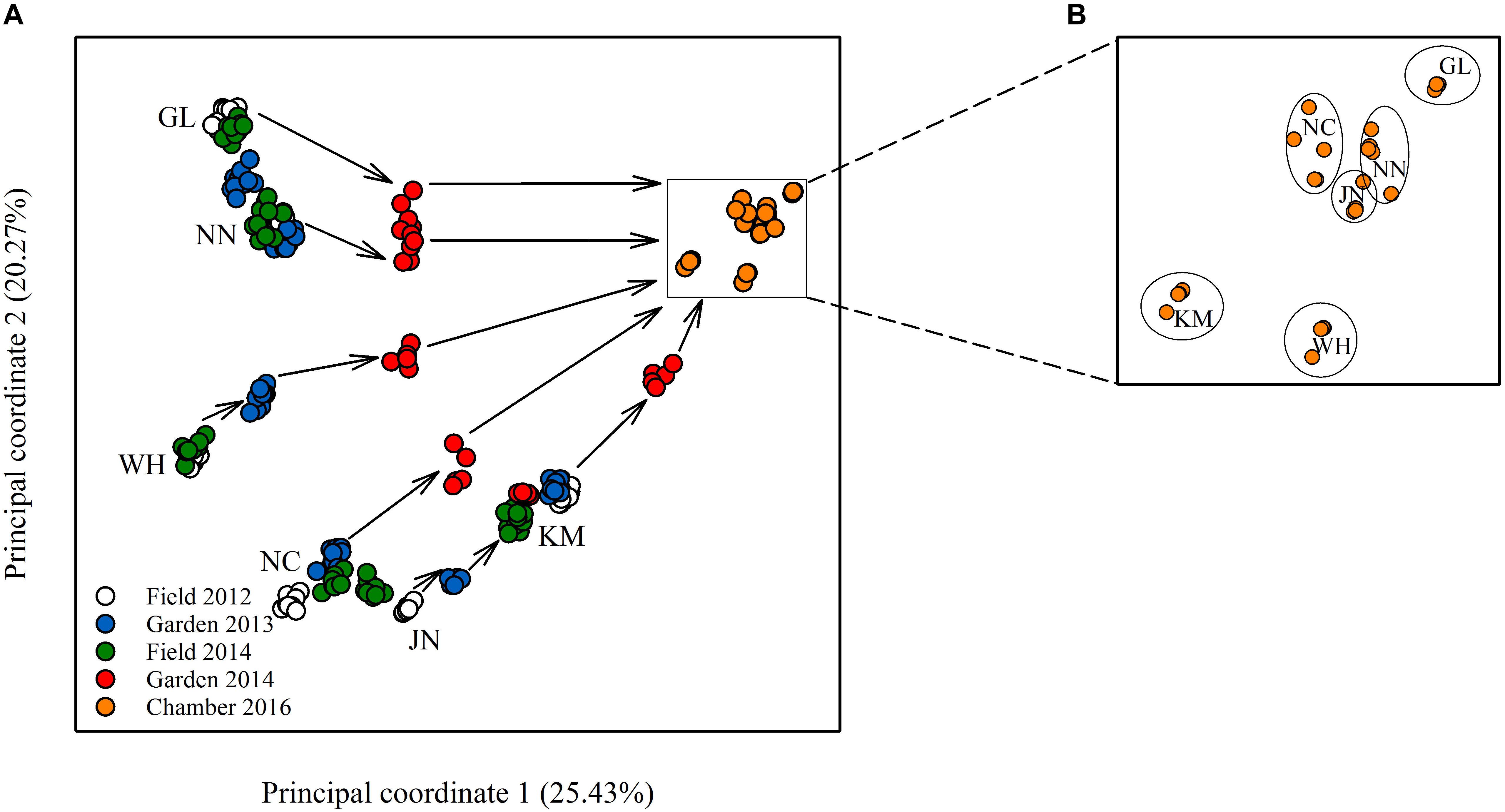 Figure 2. Plot of principal coordinate analysis showing (A) the relative epigenetic distances among the different populations in the field and common environments, and, in a zoom-in, (B) the population clustering remaining after 10 asexual generations.