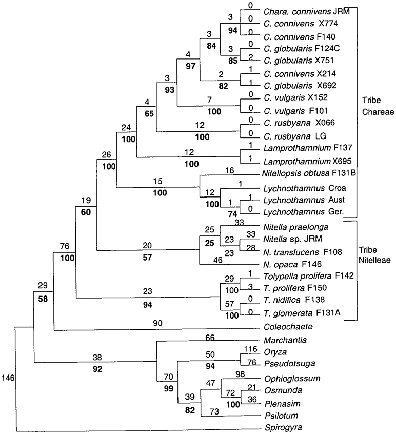 Figure 1. Detailed phylogenetic tree of the Characeae with branching to other charophytes and land plants. For details see Figure 1 of McCourt et al. (1999).