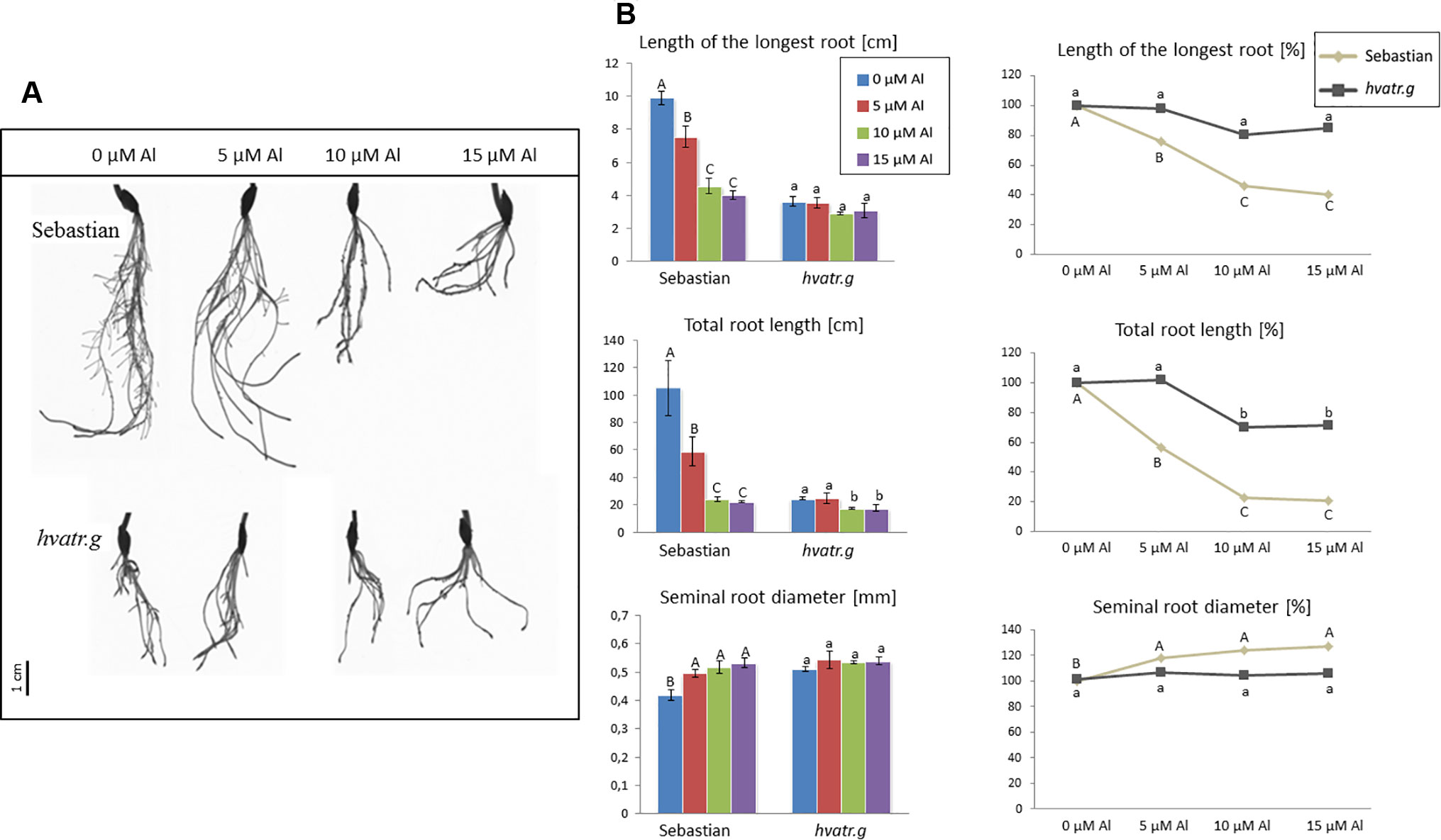 Figure 2 (A) Comparison of a root system of the hvatr.g mutant and cv. ‘Sebastian’ grown for 7 days in Magnavaca solution at pH 4.0 without Al and with 5, 10, and 15 μM of bioavailable Al3+ ions. (B) Main root parameters of ‘Sebastian’ and the hvatr.g mutant grown for 7 days in Magnavaca solution at pH 4.0 without Al and with 5, 10, and 15 μM of bioavailable Al3+ ions. The parameters are presented as direct values (in centimeters) and as percentage, where 100% is the value for untreated roots of the genotype. Presented parameters: length of the longest root, total length of the whole root system (seminals + laterals), and average diameter of seminal roots. Statistically significant differences between different doses of Al within each genotype were assessed using ANOVA (P < 0.05) followed by Tukey’s honestly significant difference test (Tukey HSD test, P < 0.05) and are indicated by different uppercase letters for the ‘Sebastian’ variety and by different lowercase letters for the hvatr.g mutant.