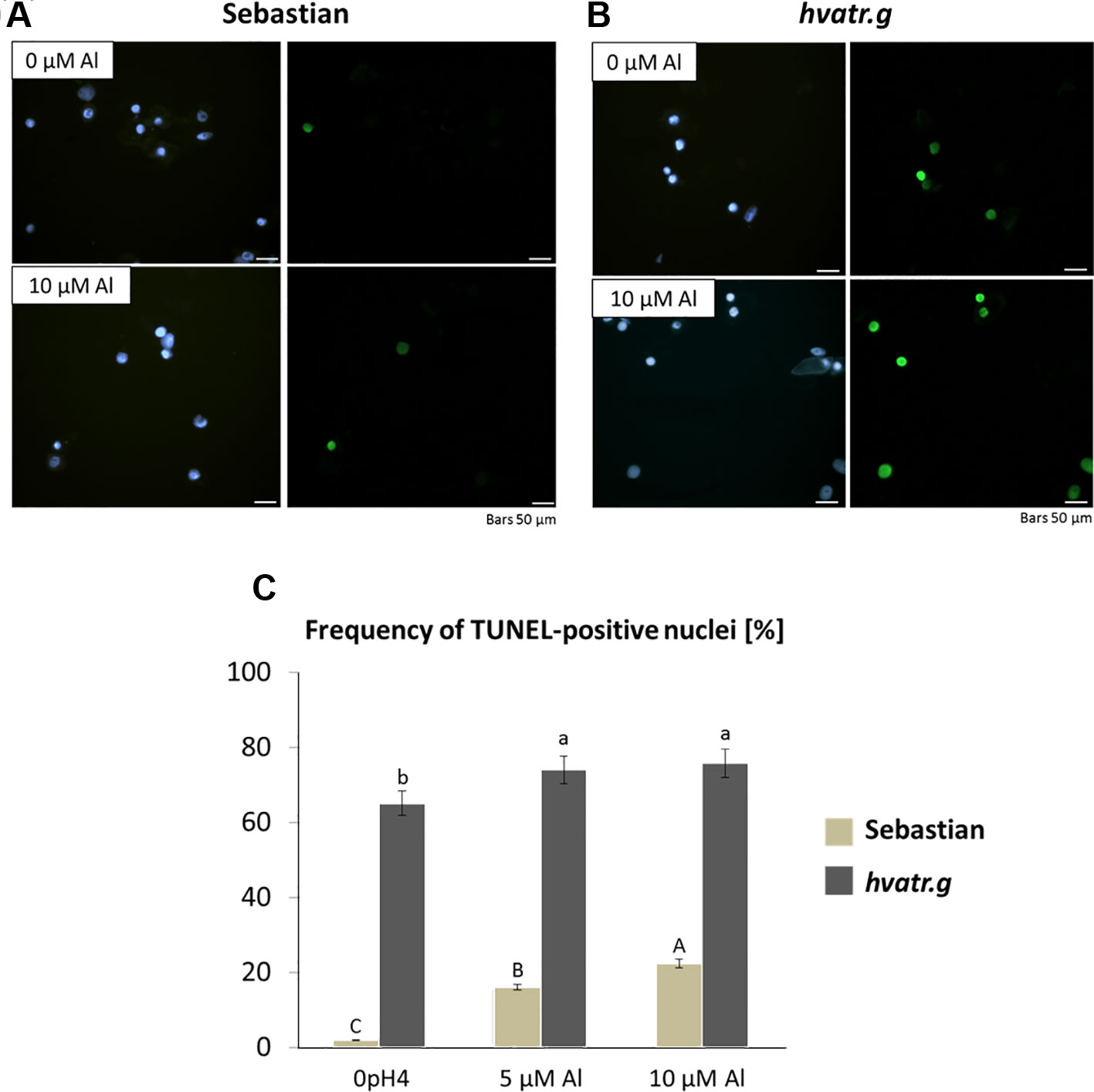 Figure 6 Results of the TUNEL test in the root meristematic cells of ‘Sebastian’ and the hvatr.g seedlings treated with Al. (A) Examples of damaged nuclei observed in control ‘Sebastian’ roots and roots treated with 10 µM Al. Left Images of DAPI-stained nuclei. Right Images from the FITC channel. (B) Examples of damaged nuclei observed in control hvatr.g roots and roots treated with 10 µM Al. Left Images of DAPI-stained nuclei. Right Images from the FITC channel. (C) Frequency of labelled nuclei in the root cells of analyzed genotypes treated with 5 and 10 µM Al. The significant differences (P < 0.05) between the groups are indicated by different letters (uppercase letters for 'Sebastian' and lowercase letters for hvatr.g mutant).