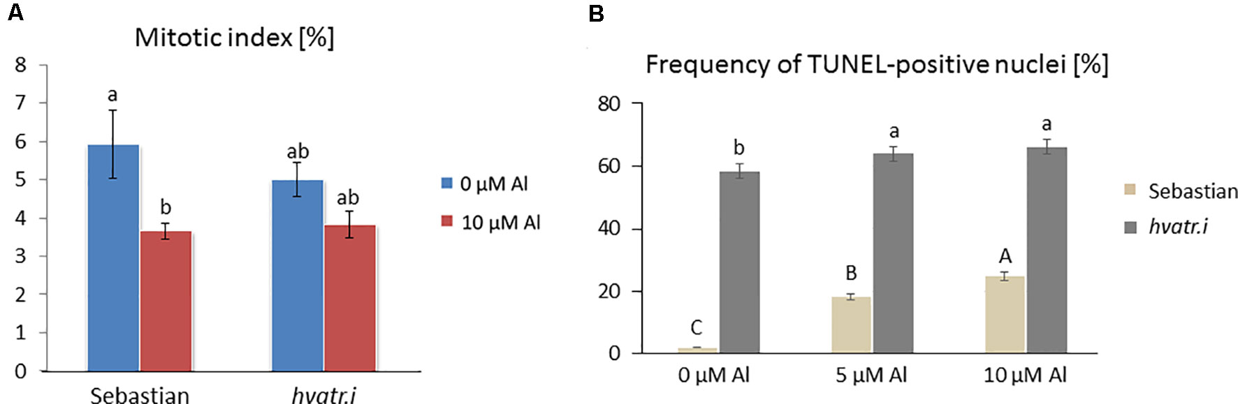 Figure 8 Cytological analysis of the hvatr.i mutant and its parent variety ‘Sebastian’. (A) Mitotic activity in the root meristems of untreated and Al-treated plants. (B) Results of the TUNEL test—frequency of labeled nuclei in the root cells of analyzed genotypes untreated and treated with 5 and 10 µM Al. The significant differences (P < 0.05) between the groups are indicated by different letters (uppercase letters for 'Sebastian' and lowercase letters for hvatr.g mutant).