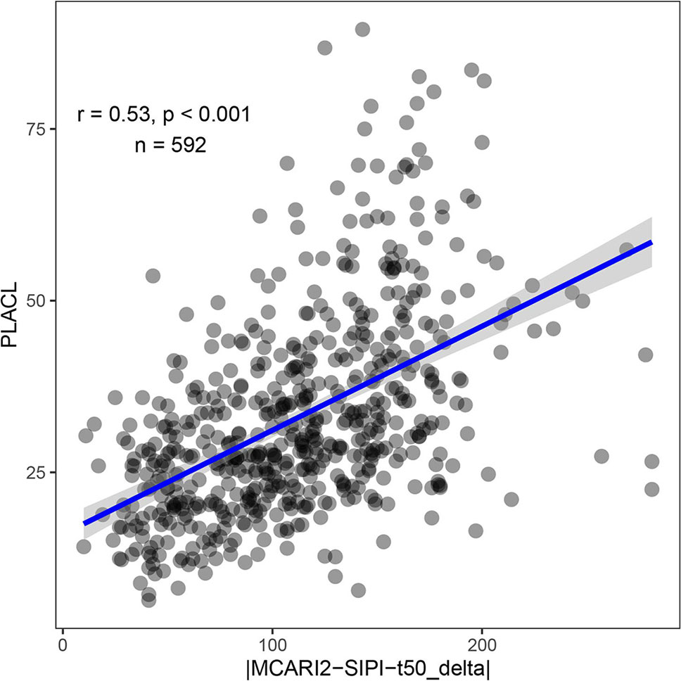 Figure 11 STB severity as measured by the percent leaf area covered by lesions (PLACL) plotted against the spectral–temporal feature identified as most predictive of STB severity (the difference between t50 extracted from the MCARI2 and SIPI spectral vegetation indices, expressed in growing degree days). The Pearson product moment correlation coefficient and the p-value of the linear correlation are based on 592 experimental plots. Data was collected in a separate experiment conducted in 2016 without artificial inoculation. In this experiment, 330 genotypes were grown in two replicates, but some plots were excluded from the analysis due to heavy lodging.