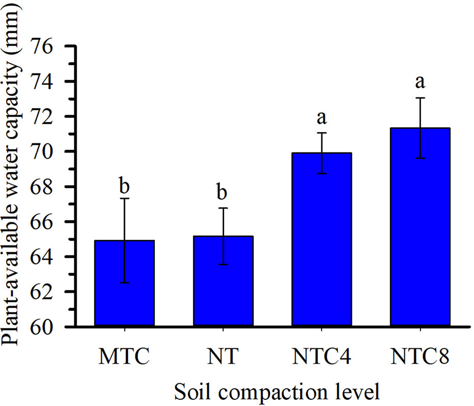 Figure 4 Plant-available water capacity in the 0–50 cm depth under soil compaction levels of a Rhodic Eutrudox. Means followed by the same letters do not differ by Tukey’s test at the 5% level; Bars indicate the standard error of the mean. MTC: minimum tillage with chiseling; NT: no-till system; NTC4: no-tillage with four passes of a tractor; NTC8: no-tillage with eight passes of a harvester.