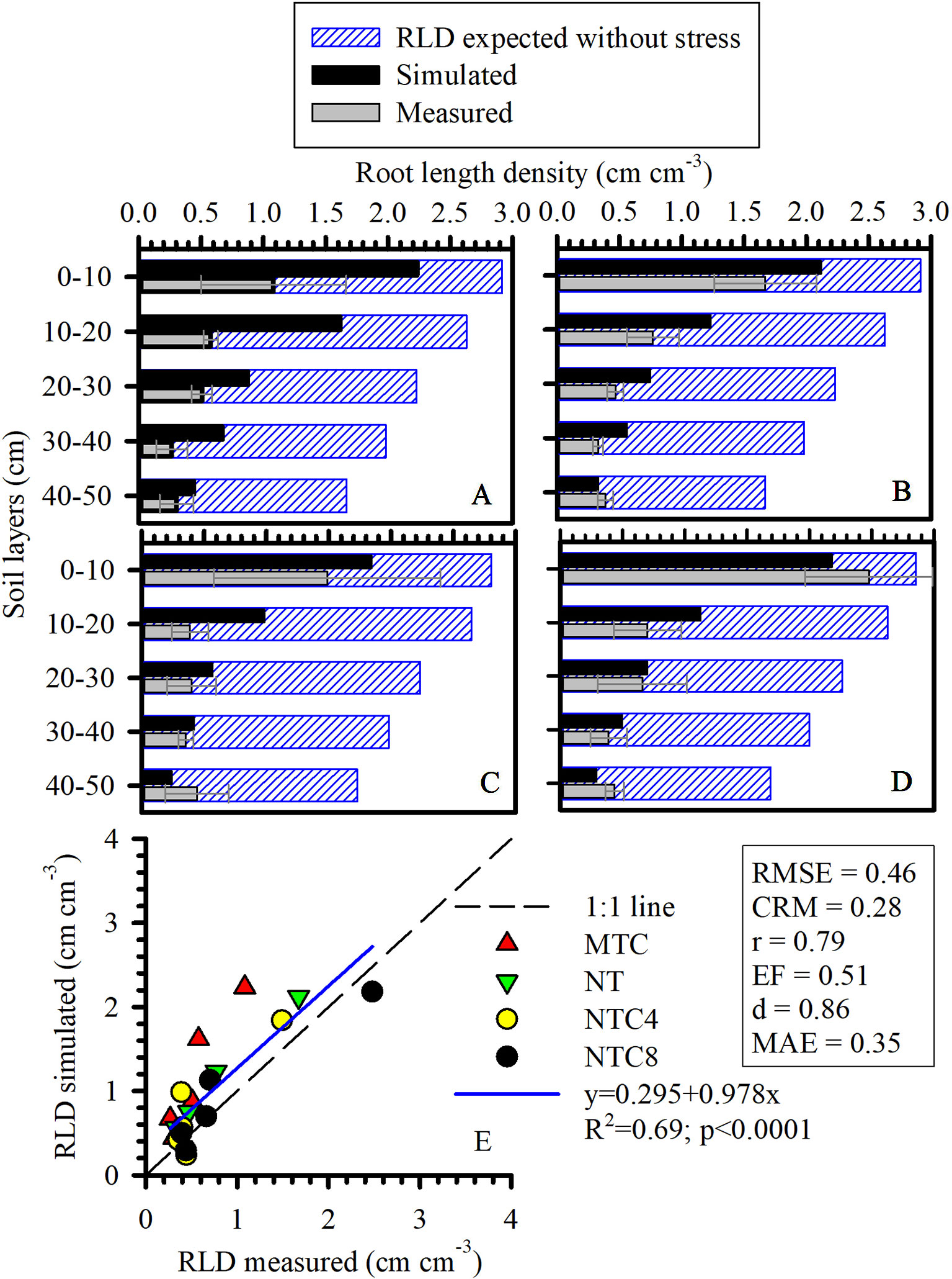 Figure 9 One-dimensional distribution (1D) of root length density (RLD) of maize simulated, measured, and expected without stress under (A) reduced tillage system (MTC), (B) no-tillage system (NT), (C) no-tillage system with four tractor passes (NTC4), or (D) no-tillage system with eight harvester passes (NTC8), and (E) relationship of simulated and measured RLD in a Rhodic Eutrudox. RMSE: root-mean-square error; CRM: coefficient of residual mass; MAE, mean absolute error.