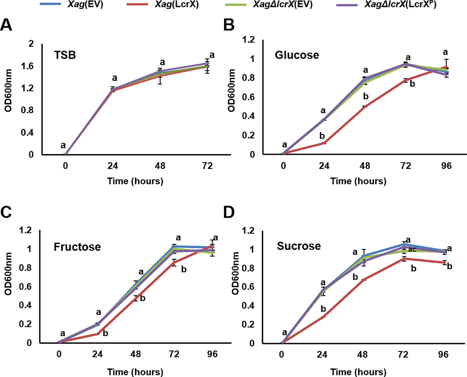 Figure 6 Growth of Xag strains on TSB and M9 minimal medium containing different sugar sources. Xag strains were grown at 28°C in TSB (A), and modified M9 medium with 0.4% glucose (B), fructose (C), or sucrose (D). The bacterial cells were measured at 24-h intervals at an OD of 600 nm. Different letters on error bar graph indicate significant differences by one-way ANOVA (p < 0.05). This experiment was repeated at least three times.