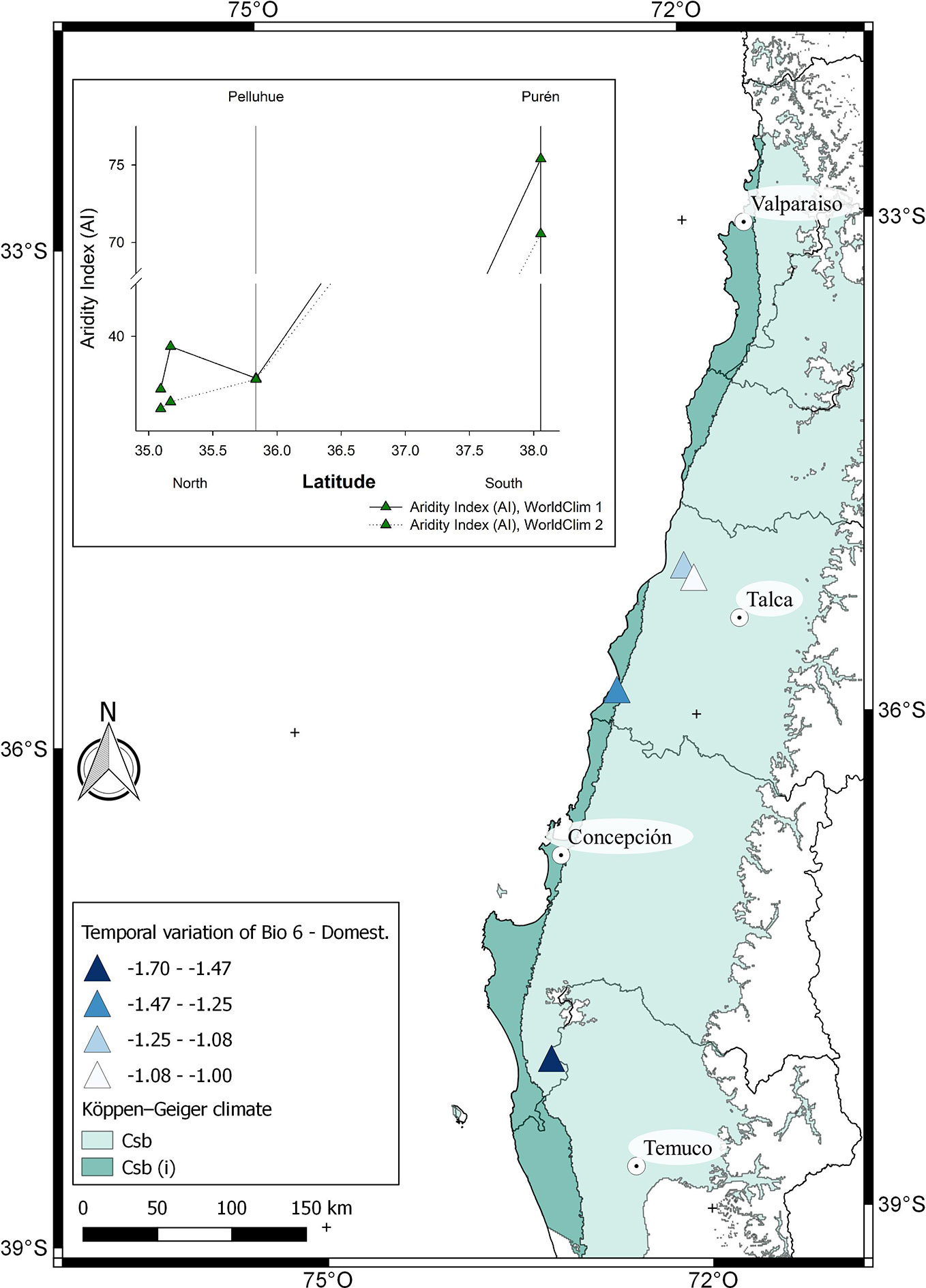 Figure 6 Climatic characterization of the localities where F. chiloensis f. chiloensis is cultivated in Chile and distributed from North to South. The comparison of Bioclimatic variable 6 (Min temperature of coldest month) between WorldClim 1 and 2 for each location is shown in the map. In the insert, De Martonne Aridity Index (AI) for each locality.