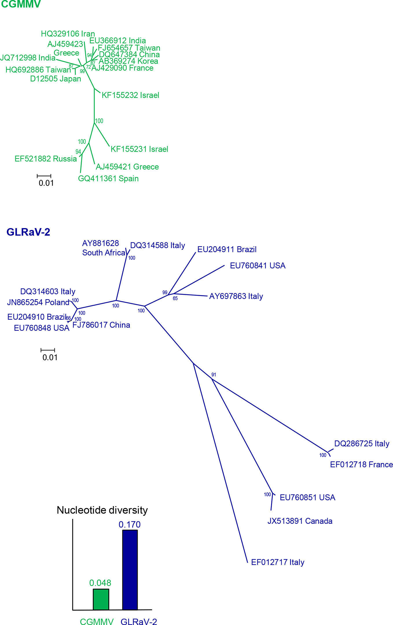Figure 2 Nucleotide diversities and unrooted neighbor-joining trees of the coat protein gene of 15 isolates of cucumber green mottle mosaic virus (CGMMV) and grapevine leafroll-associated virus 2 (GLRaV-2). Branch lengths are proportional to the genetic distances and bootstrap values ≥ 65% are indicated.