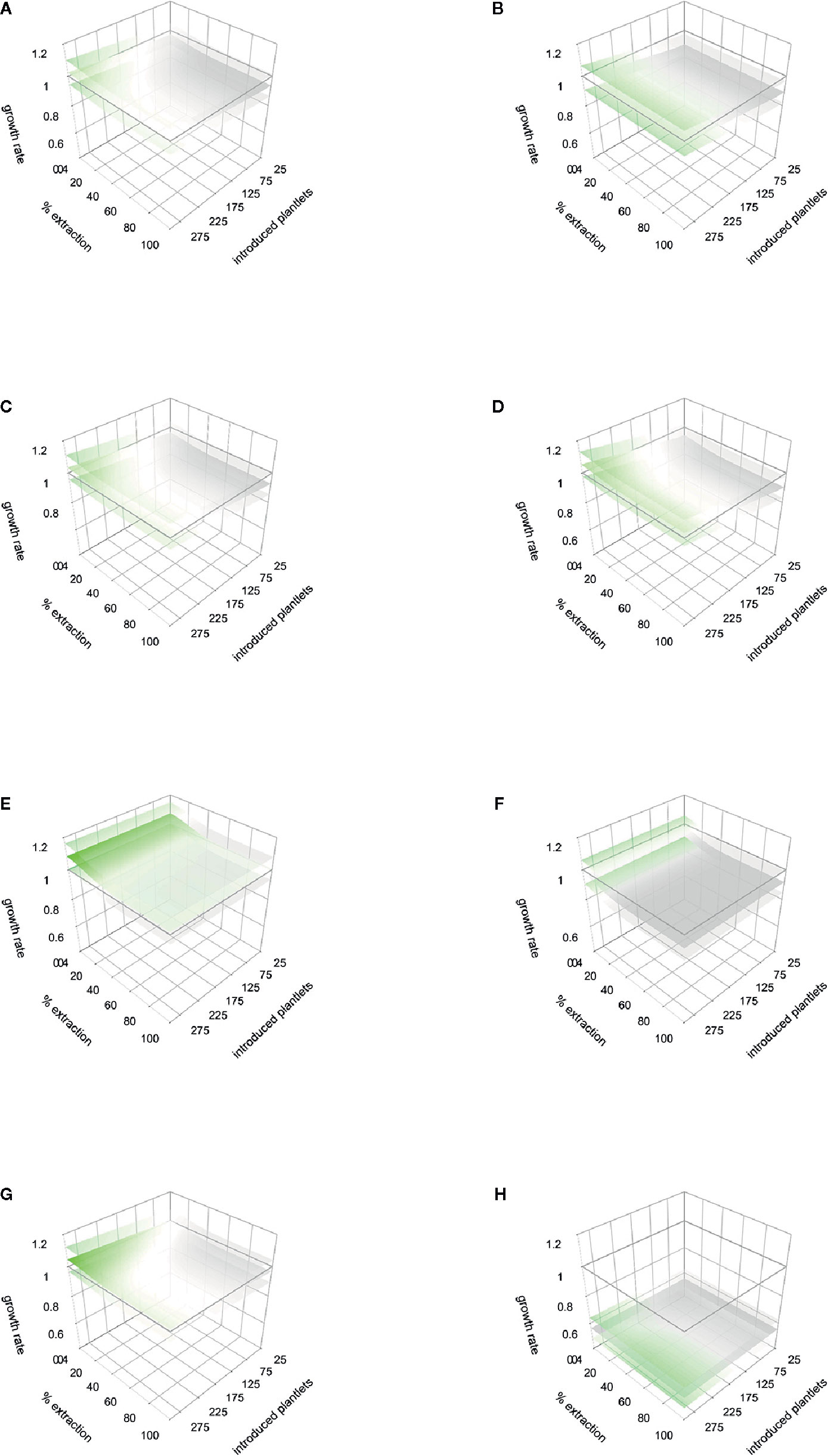 For the population Icuacato, in the first period studied, an extraction rate of 5% of adult plants can be compensated if more than 50 young agaves (6 to 12 months old) are reintroduced into the population, an extraction rate of 10% of adult plants may be sustainable if more than 75 young plants are reintroduced, and up to 100% extraction of adult plants if 275 or more young agaves are introduced to the population; all these scenarios would maintain λ > 1 (Figure 5G, and Table 6 show the amount of mature agaves that represent the percentage of extraction). For the second period, no combination of introduction and extraction allowed to maintain λ > 1 (Figure 5H).