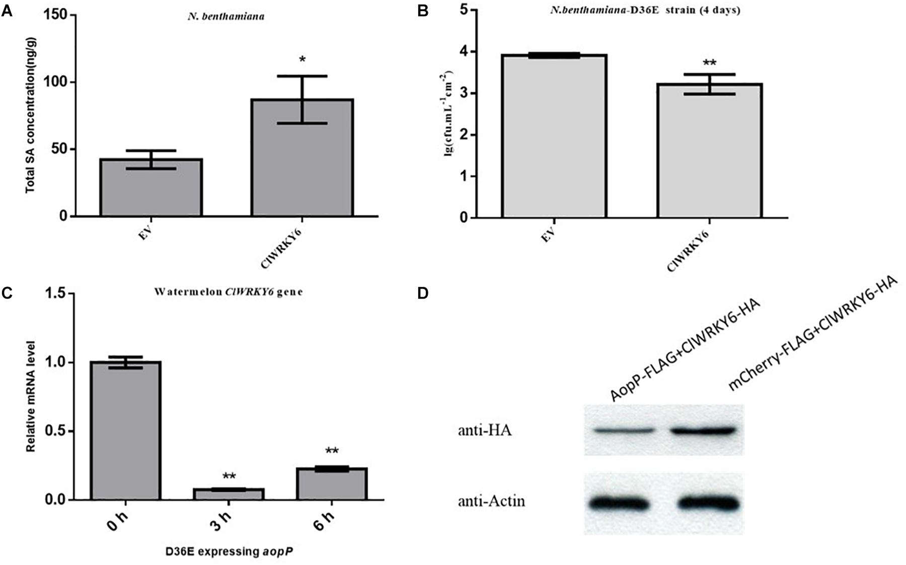 Salicylic acid content was quantified as previously described (Stork et al., 2015). Sample preparation prior to SA quantification in watermelon plants differed slightly. First, we constructed the D36E strain expressing aopP. The primers used are listed in Supplementary Table S2. Then, we fused AopP (containing 51–462 amino acids) to the above vectors and transferred it into D36E by clicking with 1.8 KV. An empty vector was transferred into D36E as a control. For watermelon plants, the D36E strain carrying aopP and an empty vector (EV) was inoculated into the cotyledons of 2-week-old watermelon seedlings at 5 × 108 CFU/mL, and the leaves were collected 24 h after inoculation. Two cotyledons were collected for each seedling, with a total of six cotyledons per sample and six technical replicates per treatment. The SA content of the samples was determined by high-performance liquid chromatography. The method used to determine the effect of ClWRKY6 on the SA content of N. benthamiana was similar to that described above (Stork et al., 2015) with the exception that ClWRKY6 fused with mCherry was transiently expressed in N. benthamiana, and the leaves were collected 48 h later to detect the SA content. A negative control was set up in which the mCherry expressed in N. benthamiana was determined. Each experiment was independently repeated three times.