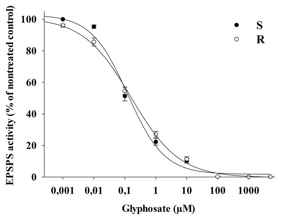 Figure 6. EPSPS enzyme activity of glyphosate-susceptible (S) and -resistant (R) Bromus catharticus populations exposed to different glyphosate concentrations (μM), expressed as a percentage of the untreated control. The predicted responses are shown by lines according to the adjusted models: (S) y = (103)/[1+(x/0.12)0.73]; p < 0.01; R2 = 0.99 and (R) y = (101)/[1+(x/0.16)0.56]; p < 0.01; R2 = 0.99.
