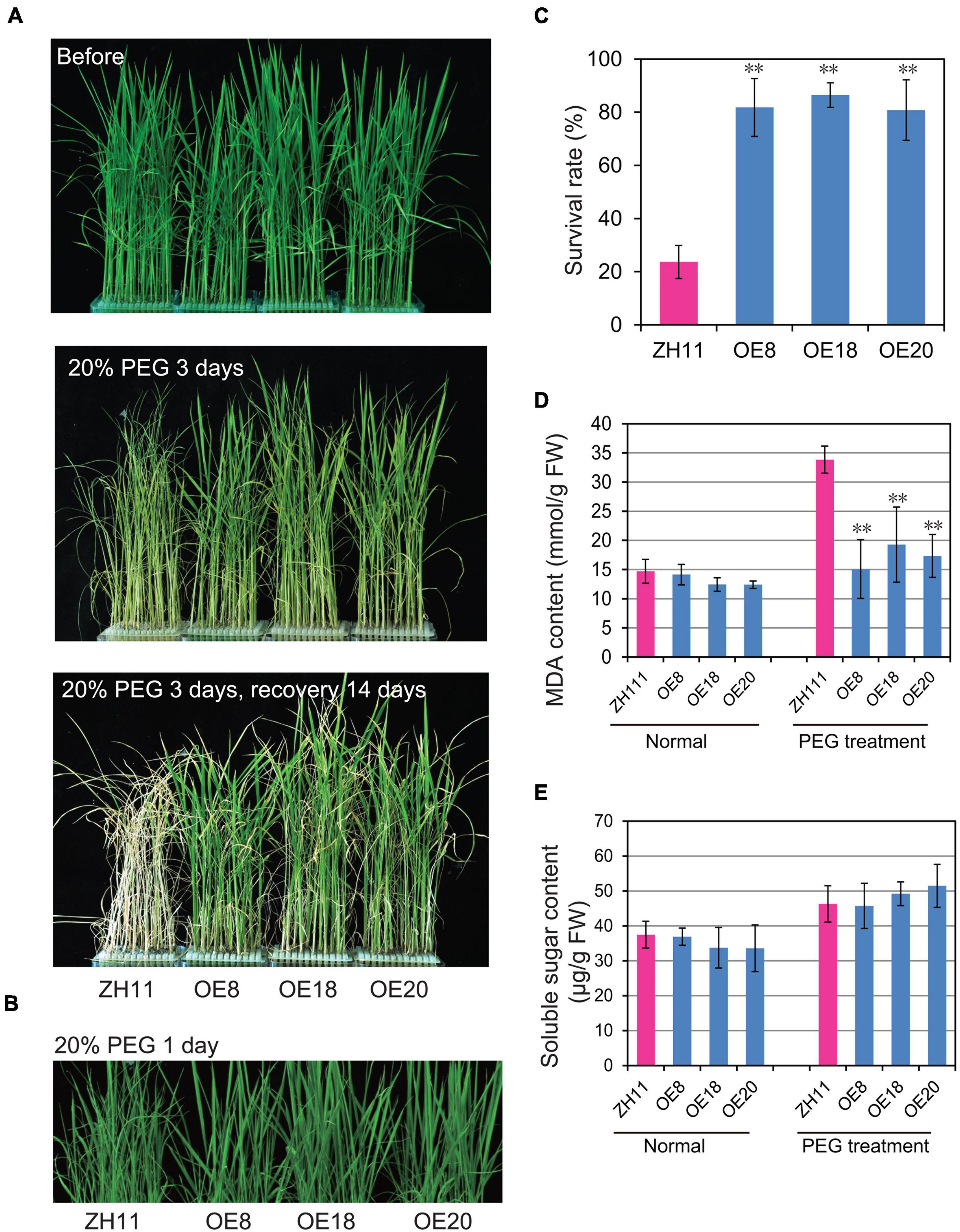 Several drought-related physiological traits of the transgenic plants were examined under drought stress. Although the soluble sugar contents of the transgenic rice leaves were similar to the WT rice (Figure 3E), the MDA contents of transgenic lines were significantly lower than WT plants under PEG-simulate osmotic stress (Figure 3D).