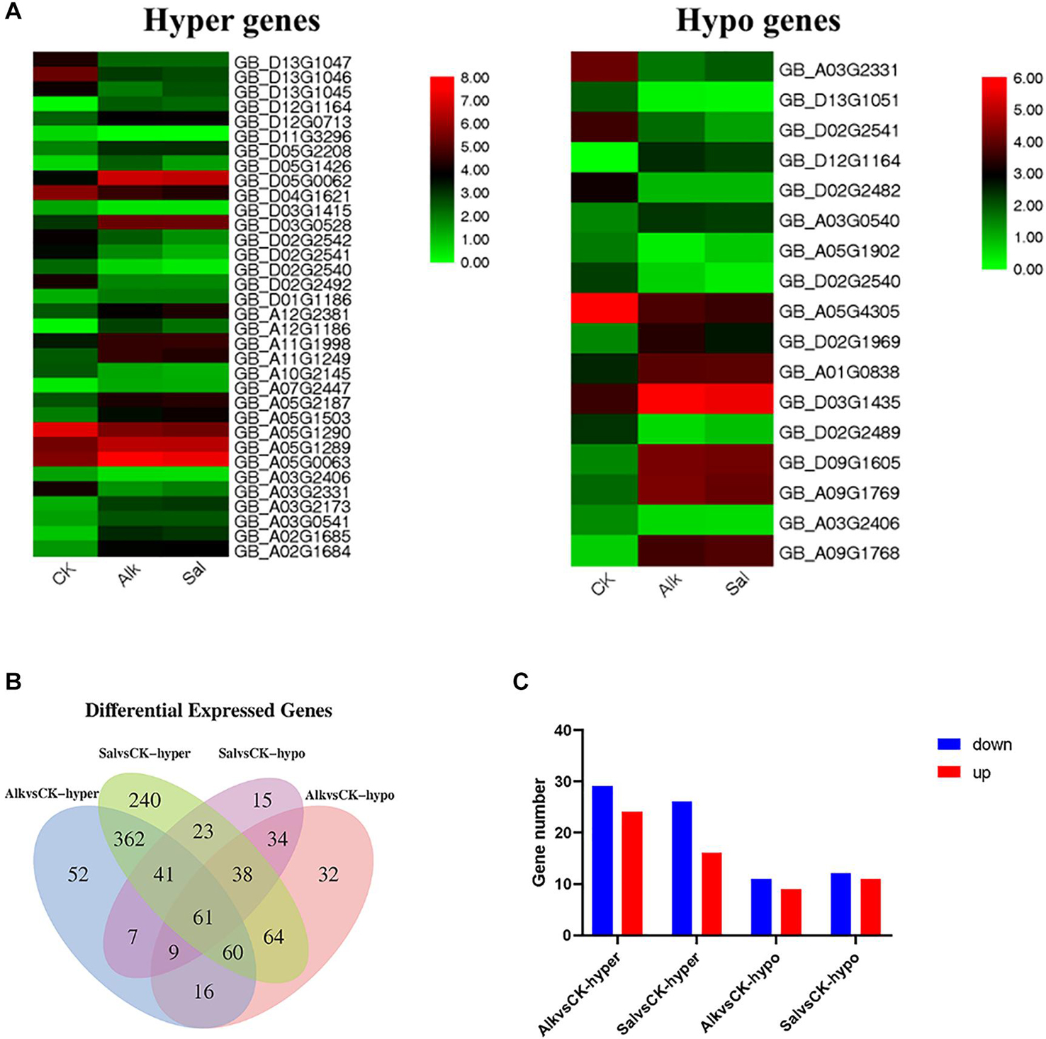 Figure 8. Analysis of the methylation and transcription levels of plant hormones in response to Na+ stress. (A) Heap maps of DEGs. (B) Venn diagram of DMR genes in plant hormone signal transduction under abiotic stress. (C) Gene numbers of DMRs in plant hormone signal transduction pathways.