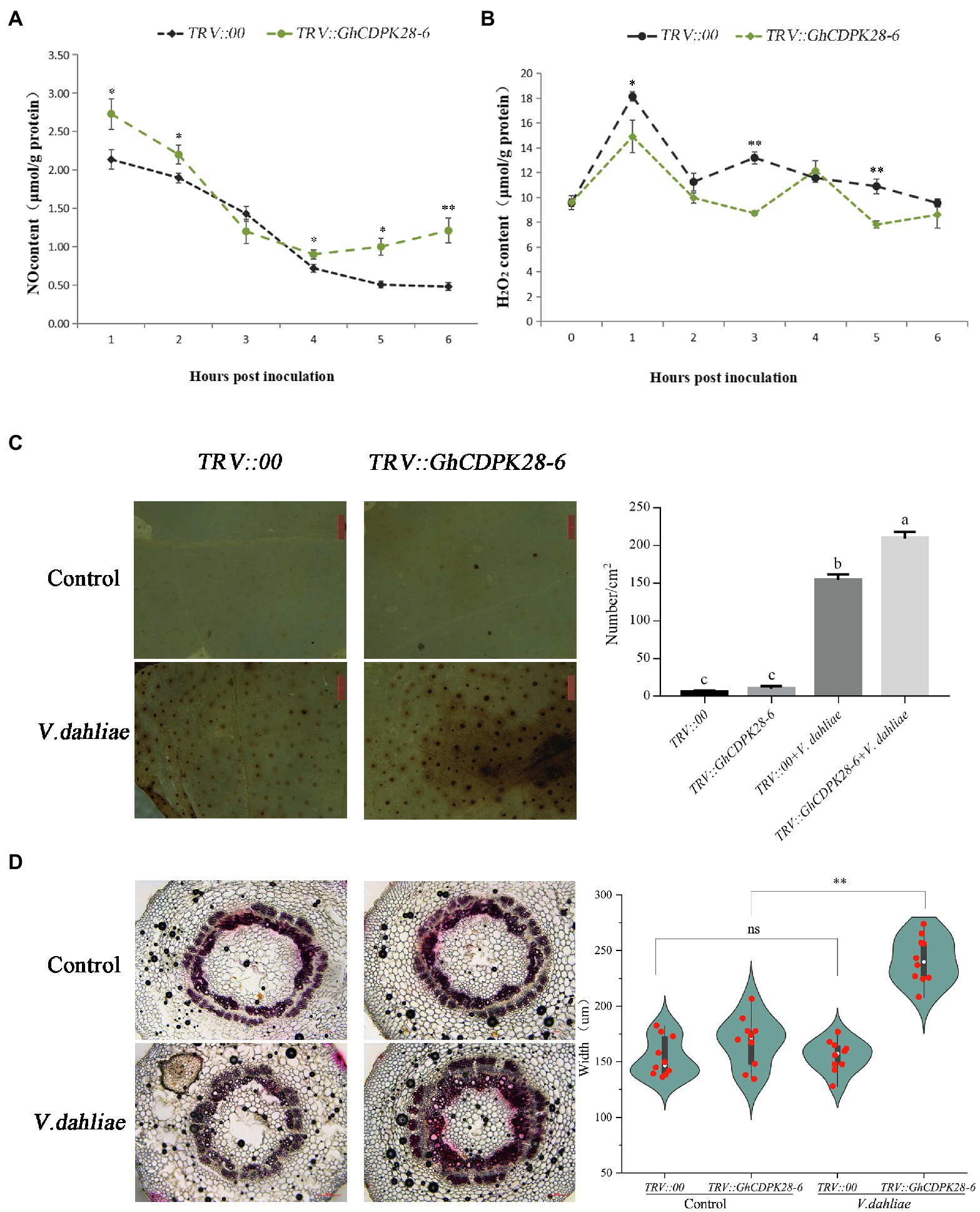 Figure 7. Accumulation of NO and H2O2, phenotypes of reactive oxygen species bursts and lignin deposition in GhCDPK28-6 silenced and control plants. (A) NO content in roots of silenced plants and control plants within 6 h after V. dahliae inoculation. (B) H2O2 content in roots of silenced plants and control plants within 6 h after V. dahliae inoculation. (C) Production and accumulation of ROS in cotton leaves after 12 h of V. dahliae inoculation, and quantitative analysis of ROS. DAB staining was used for detection. It was observed under the stereomicroscope with 10× amplification and the number of stained spots per cm2 was recorded. The scale is 1 mm. (D) After 72 h of inoculation, cotton vascular bundles were stained with phloroglucinol and their widths were recorded. The scale is 200 μm. The experiment was repeated three times (*p < 0.05; **p < 0.001, Student’s t-test).