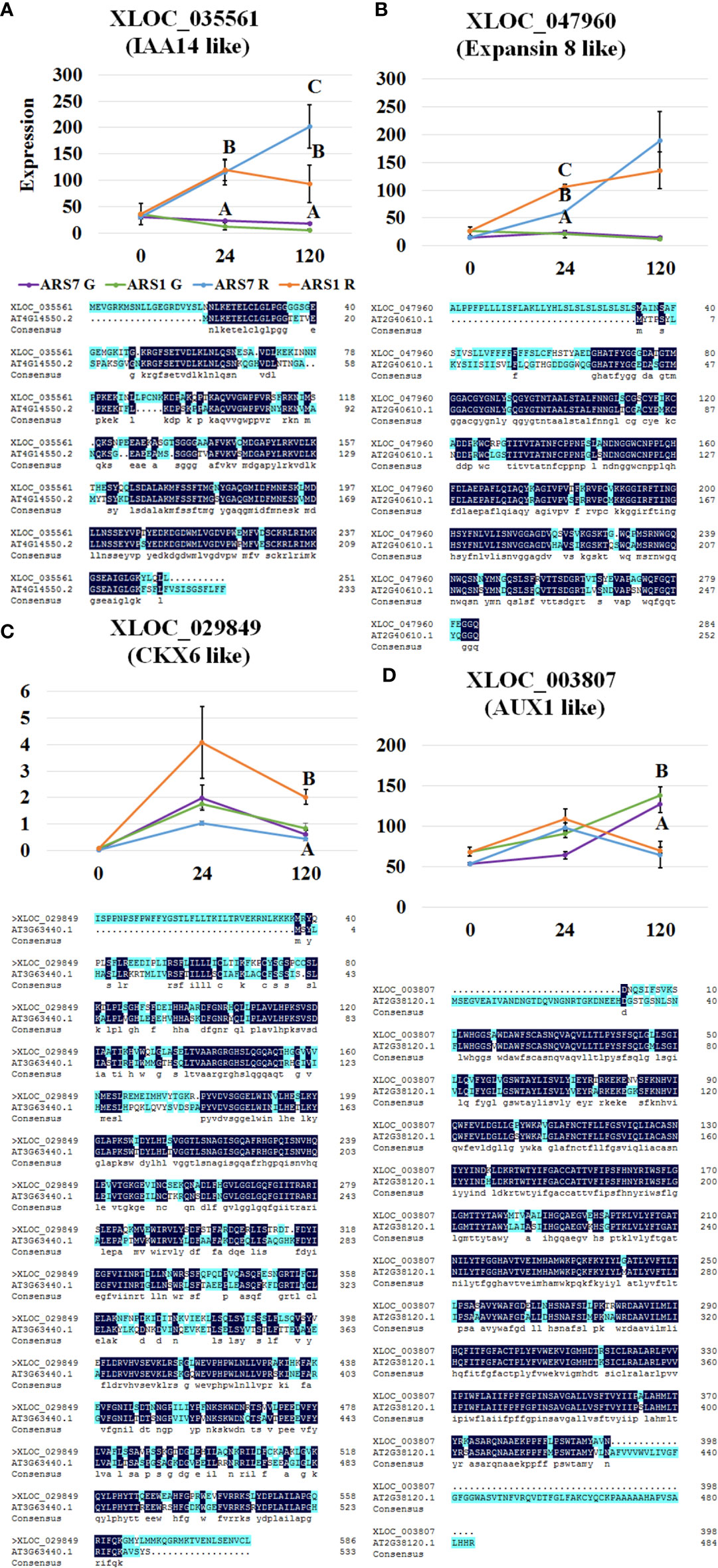 Figure 6 Expression profiles of specific genes. Expression levels were determined as number of reads in the RNA-seq using three repeats for each treatment. The best assembled hit for each transcript was translated and the amino acid sequence was aligned to that of the corresponding Arabidopsis transcript. G, grafted tissue; R, rooting tissue. (A) Expression of solitary root IAA14-like. (B) Cytokinin oxidase/dehydrogenase-like (CKX6-like), which participates in cytokinin catabolism. (C) Expansin 8-like, involved in cell wall loosening. (D) Auxin influx transporter AUX1-like. Different letters show statistically significant difference by one-way ANOVA at p < 0.05.