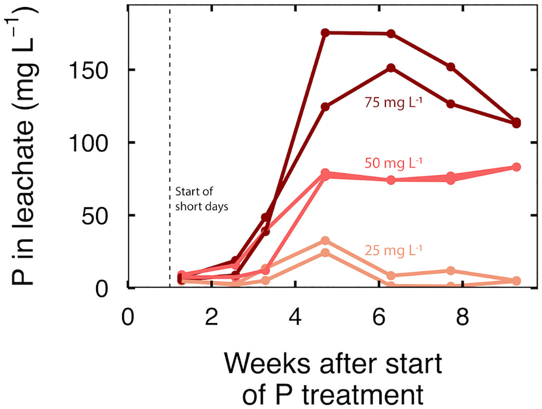 P in the leachate increased to a maximum in all treatments at five weeks, followed by a decline or stable leachate P concentration for the final 4 weeks (Figure 2). As expected, increasing P input increased P in the leachate. At an input of 25 mg per L, leachate P concentration increased to a maximum of 28 mg per L, then dropped to less than 10 mg per L; at an input of 50 mg per L, P in the leachate increased to 75 mg per L and remained stable; at an input of 75 mg per L, P in the leachate increased to about 160 mg per L but declined to about 115 mg per L P at harvest (Figure 2).