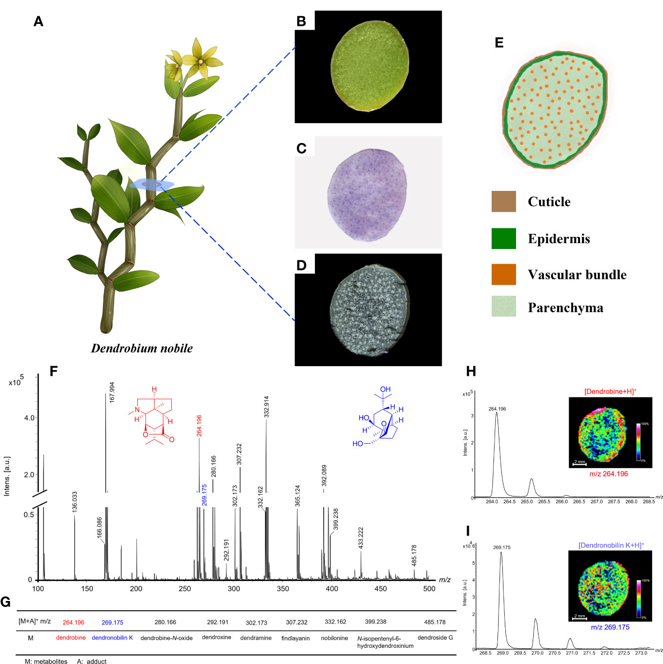 Analyzing the metabolic profiling and spatial distribution of important metabolites in mature D. nobile stem is critical for the thoroughly understanding of its physiological changes and precise utilization of the prized plant resource. Recently, metabolomics has developed rapidly and applied widely to profile plant metabolites and study plant physiology (Šimura et al., 2018). In particular, the application of UPLC-QTOF-MS improved the resolution, sensitivity, and throughput for metabolites detection (Gu et al., 2019), which made the metabolomics studies possible to probe greater amounts of metabolic information for complex biological mixtures and discover previously unidentified metabolites (Tong et al., 2022). For the studies on metabolite spatial distribution, mass spectrometry imaging (MSI) has been developed as a powerful in-situ analysis technique to visualize the spatial distribution of metabolites in complex biological mixtures (He et al., 2019). Among MSI technologies, the matrix-assisted laser desorption/ionization mass spectrometry imaging (MALDI-MSI) is the most frequently used because of the suitable spatial resolution of imaging (3-100 μm) and the wide measurable mass range with soft ionization type (Qin et al., 2018). MALDI-MSI has been proven successfully in the visualization of metabolites in plant tissues. For instance, it has been carried out to analyze the cyanogenic glucoside in sorghum (Montini et al., 2020), lipids in cottonseeds (Liu et al., 2021), and alkaloids in areca nut (Wu et al., 2022).