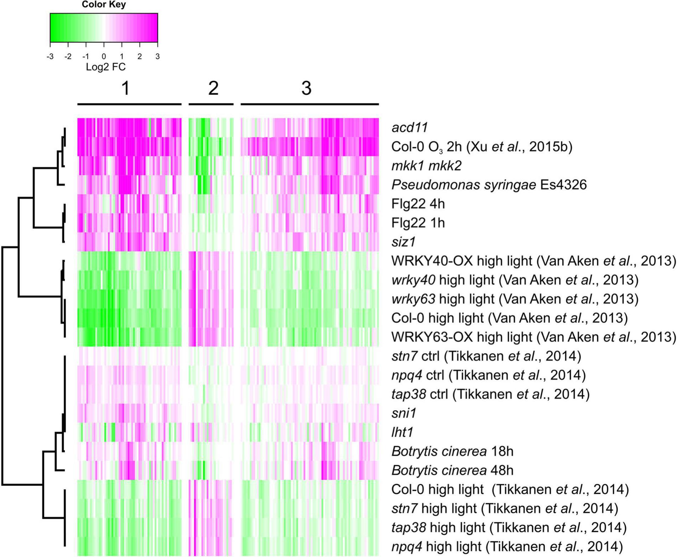 Figure 7. Pathogen regulation of genes with contrasting expression between HL and O3. Gene expression data sets include treatments with pathogens or flg22. In addition, mutants undergoing spontaneous cell death were included (see section “Materials and Methods” for full list of experiments). Genes were subjected to bootstrapped Bayesian hierarchical clustering of log2-transformed fold changes. Magenta and green indicate increased and decreased expression compared with untreated or wild type plants, respectively.