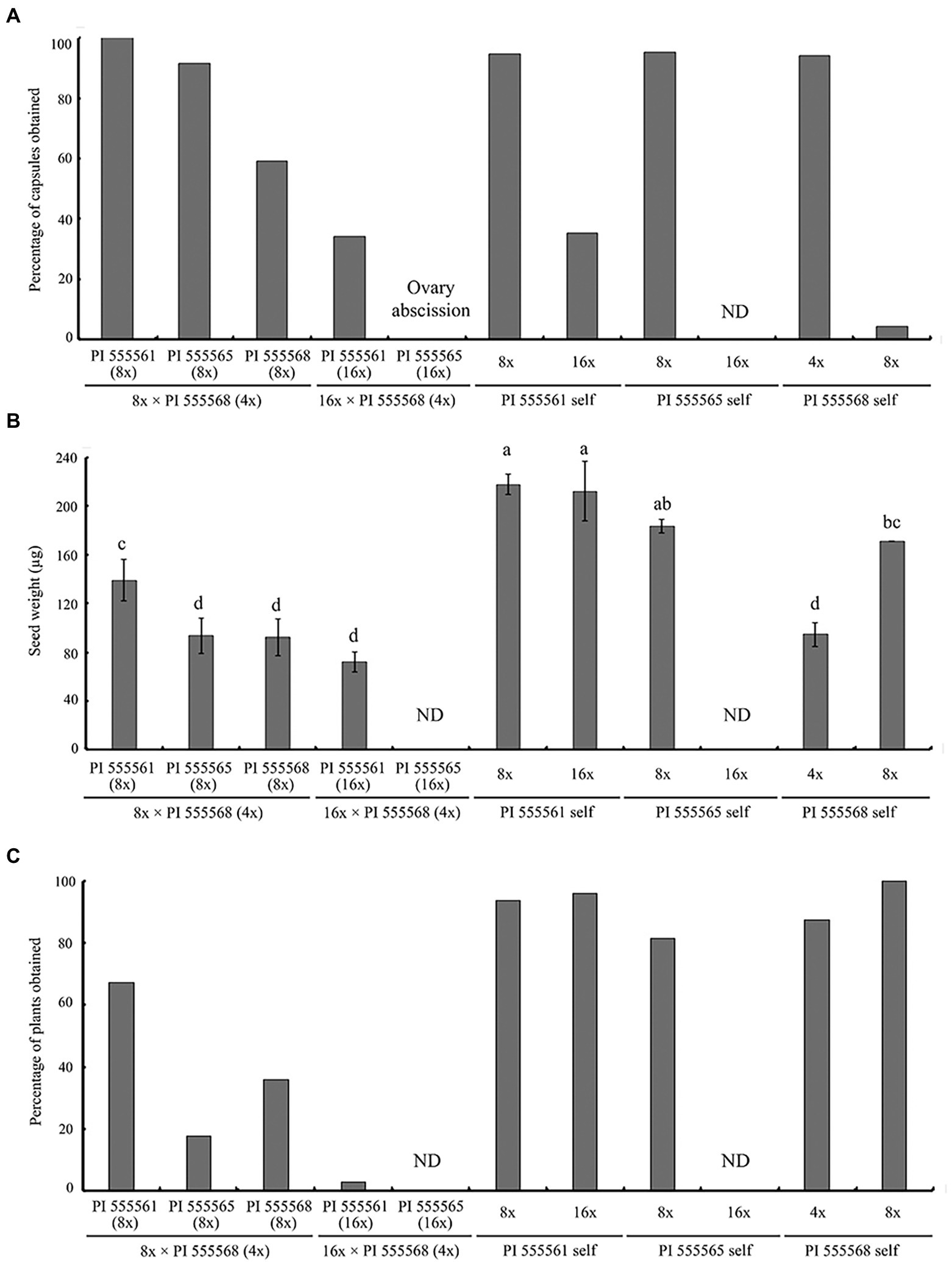 Figure 4. Ovary abscission and seed abortion were observed in intraspecific-interploidy crosses of Nicotiana suaveolens. (A) Percentages of capsules produced after pollination. (B) Single seed weight. Bars represent standard error. Different lowercase letters indicate significant differences at the 5% level as per Tukey’s test. (C) Percentages of plants obtained after seed sowing. ND, no data. The data for self-pollinations other than PI 555565 (16x) have been reported previous (He et al., 2020) and are included here for comparison.