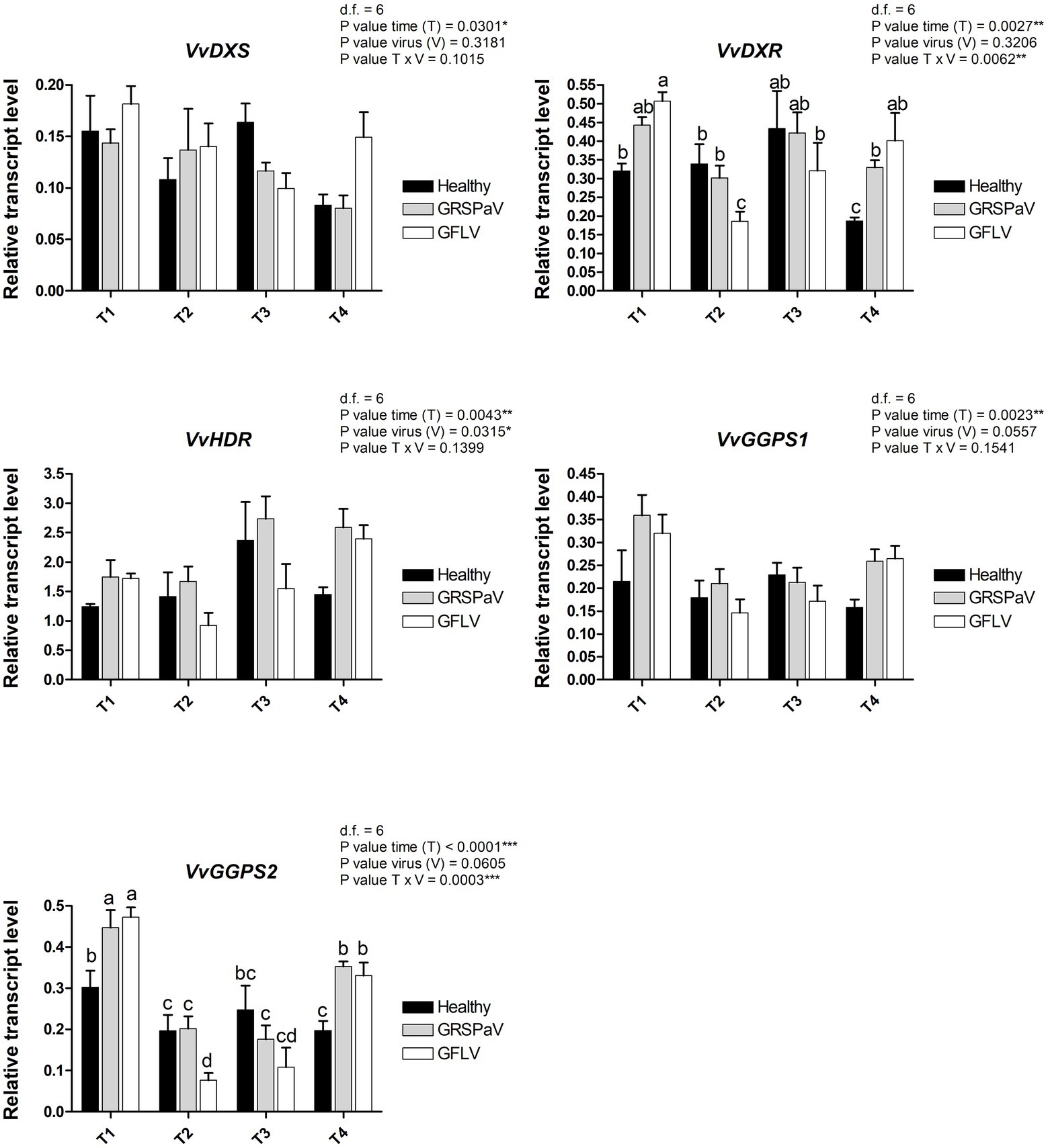 Figure 7. Relative expression levels of VvDXS (VIT_05s0020g02130), VvDXR (VIT_17s0000g08390), VvHDR (VIT_03s0063g02030), VvGGPS1 (VIT_04s0023g01210), and VvGGPS2 (VIT_18s0001g12000), measured by RT-qPCR. Samples were collected in four sampling points along the season (May_T1, June_T2, July_T3, and August_T4). RT-qPCR signals were normalized to VvAct and VvUBI transcripts. Data are presented as the mean ± SE (n = 4). Significance of sampling time, virus, and time x virus (T × V) interaction was assessed by Tukey’s HSD test for p ≤ 0.05 (*), p ≤ 0.01 (**), p ≤ 0.001 (***) and the corresponding results are given above each graph in the figure panel. Lower case letters above bars are reported when the T × V interaction are statistically significant as attested by Tukey’s HSD.