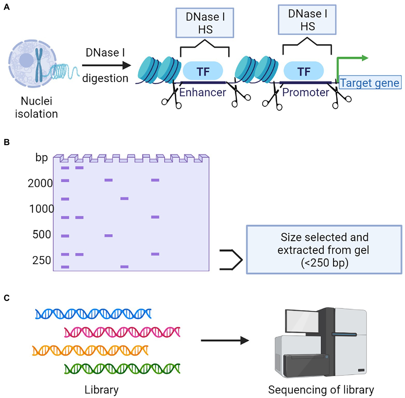 Figure 6. A schematic representation of DNase Seq to determine chromatin accessibility. (A) Nuclei isolation followed by DNase I digestion is a critical step to collect the chromatin. (B) Targeted fragments will be selected and isolated from gel. (C) Library construction followed by next-generation sequencing and data analysis.