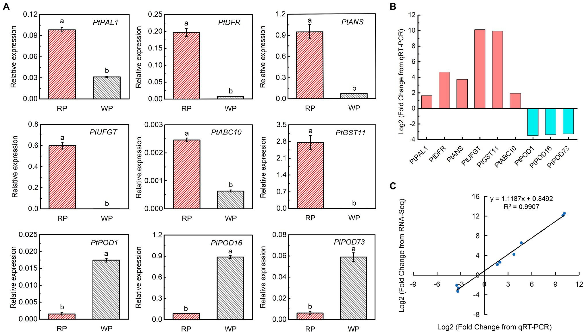 Figure 6. Expression analysis of the key significant DEGs related to the anthocyanin accumulation. (A) Gene expression of candidate key significant DEGs involved in anthocyanin synthesis, transport, and degradation. Tukey’s test significant at p < 0.05 indicated by a and b. (B) Log2Fold Change of differentially expressed anthocyanin-related genes between WP and RP from real-time PCR. (C) Correlation analysis based on RNA-seq data and real-time PCR.