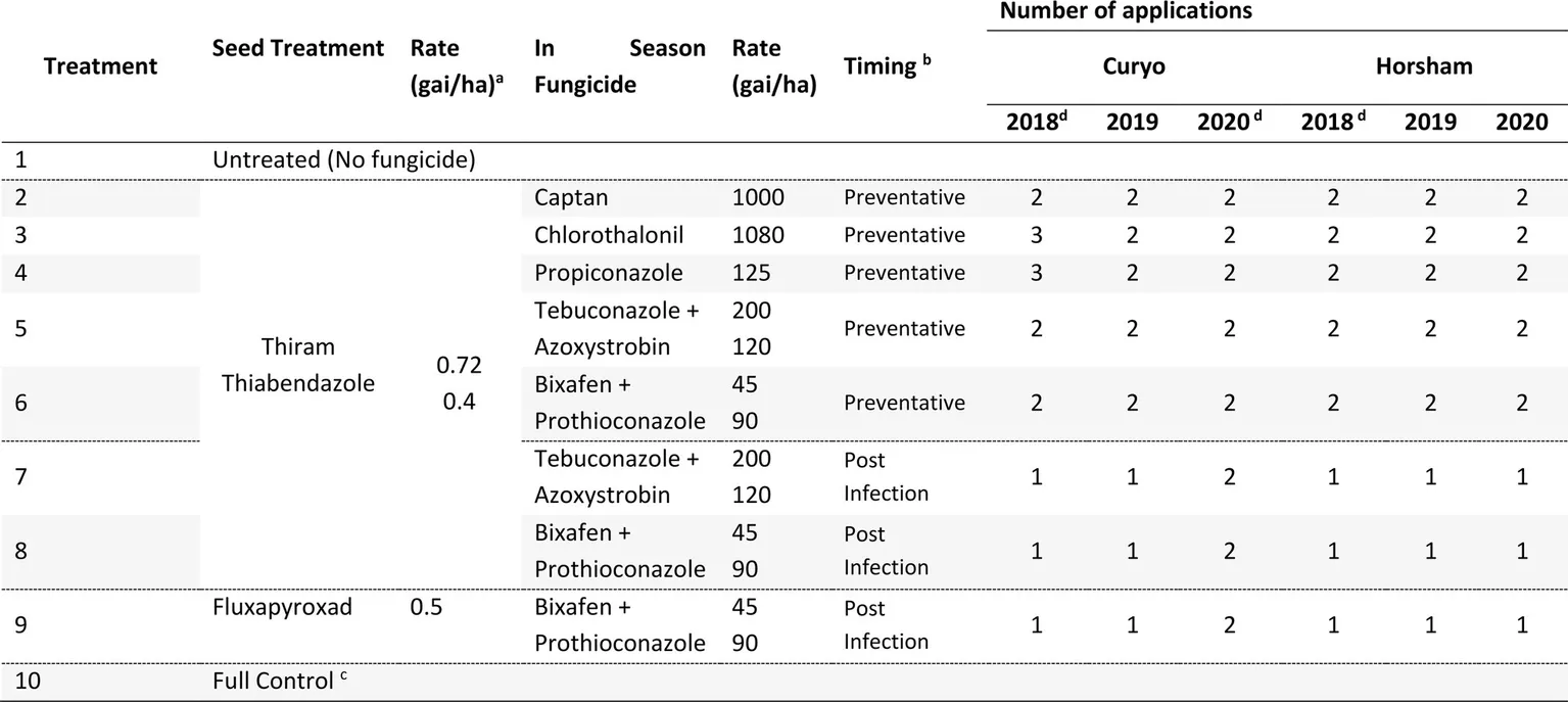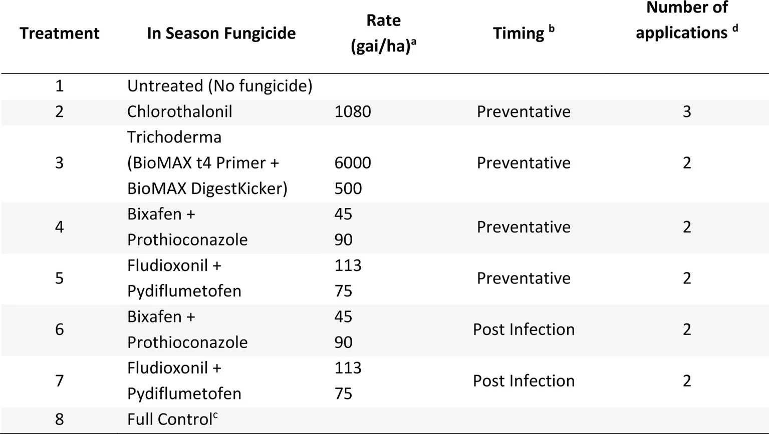 The full control treatment is a rotation of fungicide actives (Chlorothalonil, Tebuconazole + Azoxystrobin, and Bixafen + Prothioconazole) at the rates quoted in the above table applied every 2–3 weeks to ensure minimal to no disease occurred in these plots as a control in the experiment.