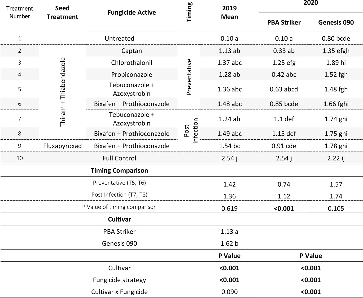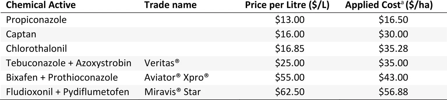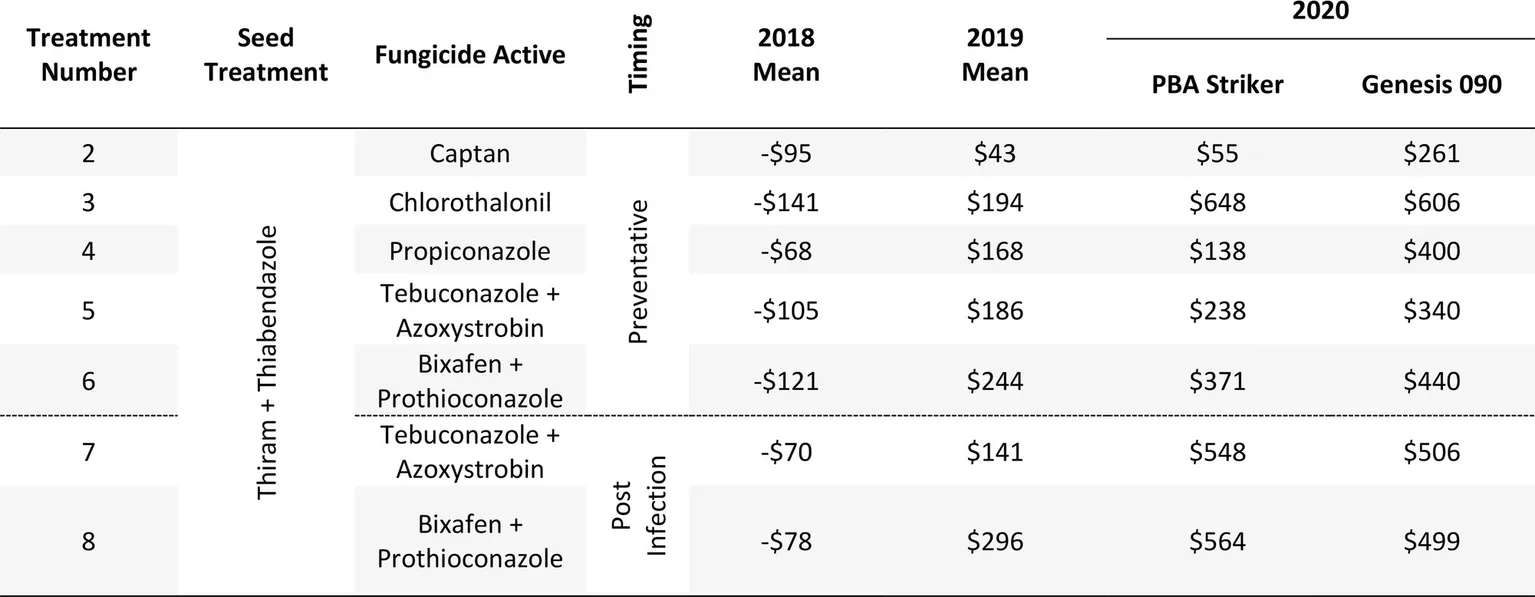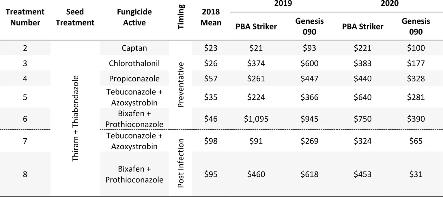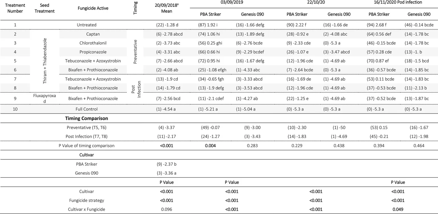 The benefit of cultivar resistance clearly highlights the importance of continued research into improving resistance. For dual active fungicides applied under the two application approaches evaluated in this study, the preventative timing is recommended for susceptible cultivars. Once cultivars with improved resistance are available to growers, the effectiveness of the preventative vs. post infection fungicide applications should be further investigated as differences between both approaches may be reduced.