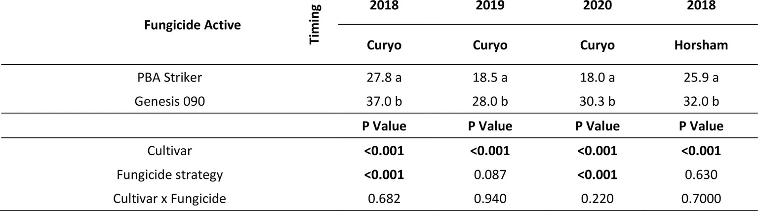 In the absence of fungicides, the cultivar Genesis 090 consistently yielded significantly higher than PBA Striker (Tables 7, 8), except at Horsham during 2019. In the full fungicide control, in the experiments where there was a significant cultivar × fungicide strategy interaction there was no significant difference in yield potential of the two cultivars (Tables 7, 8).